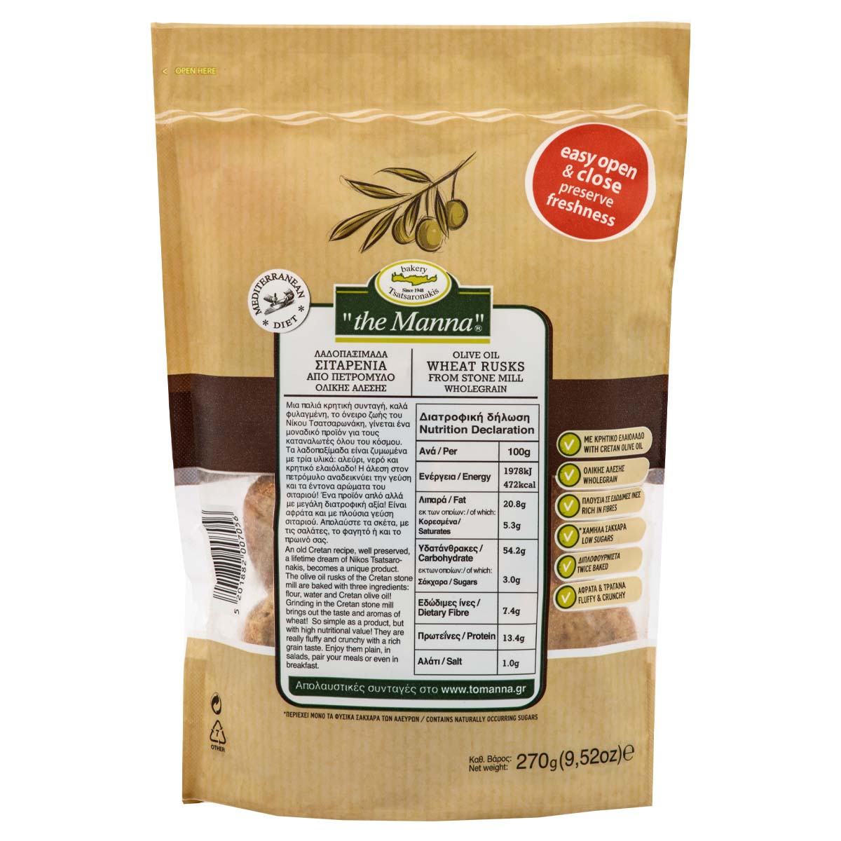 Τα αφράτα και τραγανά λαδοπαξίμαδα ολικής άλεσης από πετρόμυλο προσφέρουν πληθώρα θρεπτικών συστατικών, χάρη στα μοναδικά τους υλικά που είναι τα άλευρα σιταριού και σίκαλης ολικής αλέσεως και το κρητικό ελαιόλαδο. Λόγω της χρήσης αλεύρων σίκαλης και σιταριού ολικής άλεσης εμπεριέχουν βιταμίνες συμπλέγματος Β, όπως Β1, Β6, φυλλικό οξύ. Επιπλέον ξεχωρίζουν για την υψηλή περιεκτικότητα τους σε φυτικές ίνες οι οποίες τα καθιστούν ιδιαίτερα χορταστικά και εύπεπτα ενώ παράλληλα δημιουργούν σχετικά υψηλό επίπεδο κορεσμού για περισσότερη ώρα. Με υψηλή περιεκτικότητα σε ωφέλιμα μονοακόρεστα λιπαρά οξέα και τη μισή ποσότητα αλατιού σε σχέση με μια αντίστοιχη μερίδα ψωμιού, αποτελούν την τέλεια επιλογή για μια ισορροπημένη και υγιεινή διατροφή.