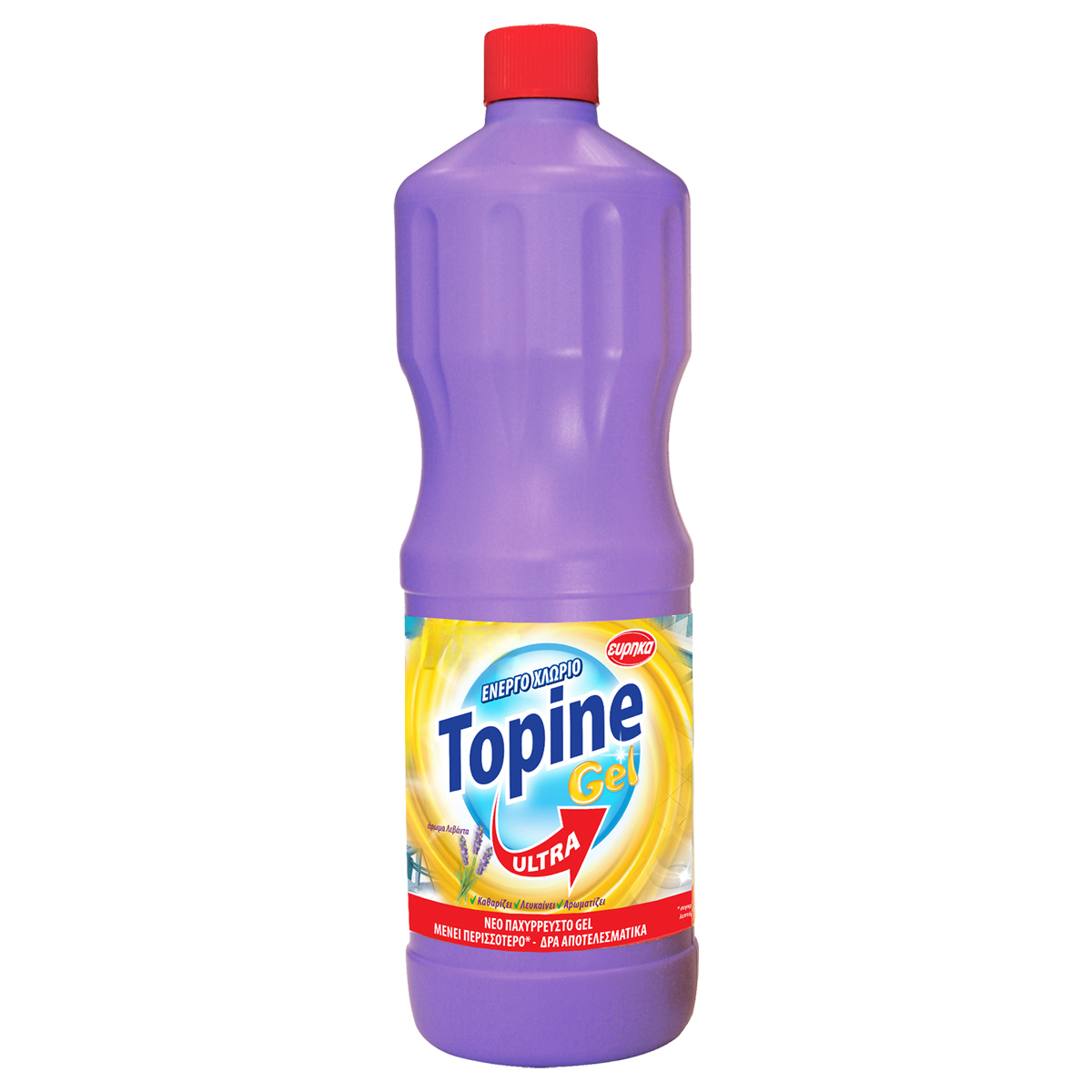 Το ενεργό χλώριο Τopine Gel Ultra στην παχύρρευστη μορφή GEL είναι ιδανικό για υγιεινή, καθαριότητα και λεύκανση. Μένει και δρα με εξαιρετικά αποτελέσματα σε κάθετες επιφάνειες π.χ. λεκάνη τουαλέτας. Καθαρίζει, λευκαίνει και αρωματίζει πλακάκια, νεροχύτες, είδη υγιεινής, επιφάνειες εμαγιέ, φορμάικα, μάρμαρα, και μωσαϊκά.