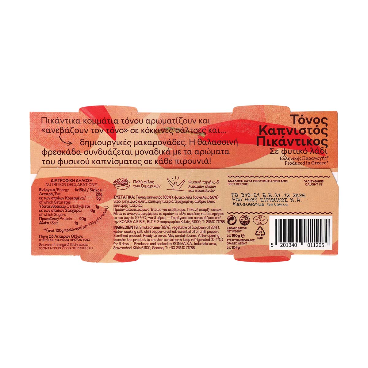 Τόνος υψηλής ποιότητας, με τον ιδιαίτερο γευστικό χαρακτήρα που του χαρίζει η ειδική επεξεργασία του φυσικού καπνίσματος με ειδικό μείγμα ξύλων. Ο συνεχής έλεγχος κατά την διάρκεια του καπνίσματος αλλά και η επιλογή ενός αργού φυσικού καπνίσματος σε χαμηλές θερμοκρασίες, διασφαλίζει την ισορροπία στην γεύση. Τα φυσικά αρωματικά συστατικά του τόνου αλλά και της προσθήκης «απαλού» φυτικού λαδιού και μπούκοβου , δημιουργούν μια ξεχωριστή καινούργια συνταγή για τους λάτρεις του τόνου.