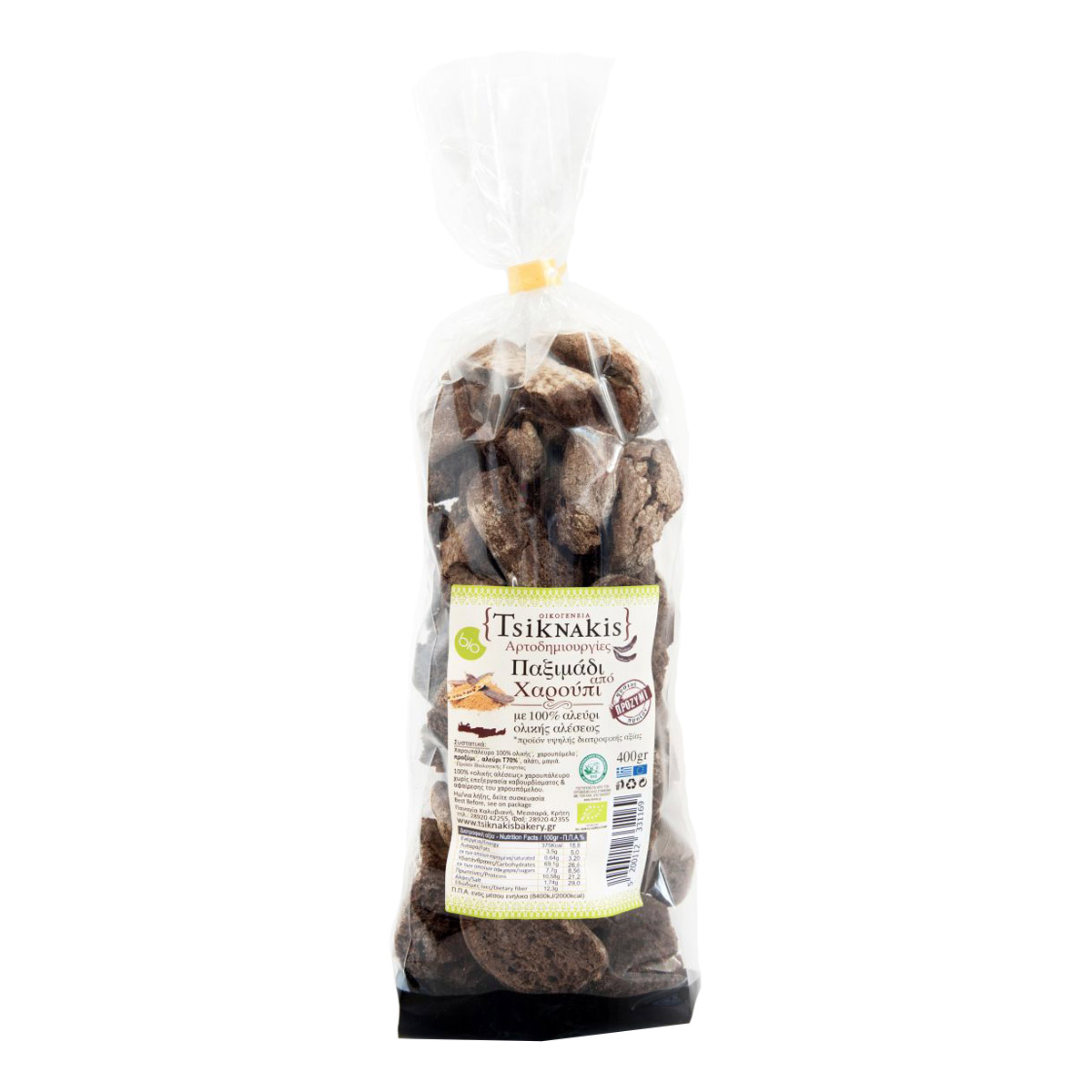 Παξιμάδι από Χαρούπι ολικής αλέσεως με χωριάτικο προζύμι από αγνά υλικά χωρίς συντηρητικά. Ψημένο με την μοναδική συνταγή της οικογένειας Τσικνάκη.
