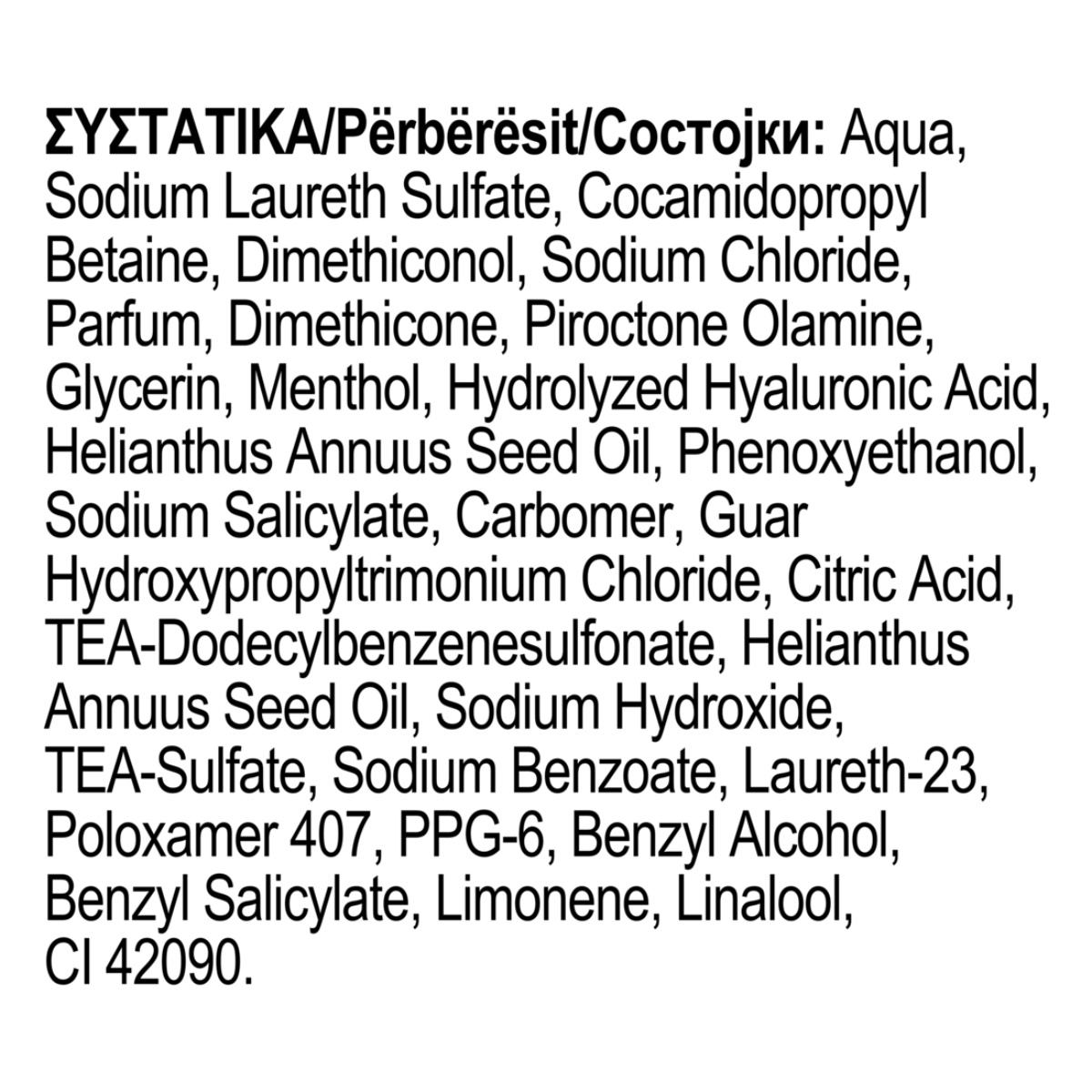 3 σε 1 Αντιπιτυριδικό Σαμπουάν, Conditioner και Αφρόλουτρο με δροσιστική μενθόλη. Έως 100% Προστασία από την Πιτυρίδα*. Φόρμουλα σε Gel με ενεργό συστατικό κατά της πιτυρίδας. Καθαρισμός, φροντίδα και φρεσκάδα για όλο το σώμα. Για κάθε τύπο μαλλιών. ΤΕΧΝΟΛΟΓΙΑ ULTRA PERFORMANCE ΚΑΤΑ ΤΗΣ ΠΙΤΥΡΙΔΑΣ που βοηθάει έως 100% στην εξάλειψη της πιτυρίδας και στην πρόληψη της επανεμφάνισής της. Υαλουρονικό Οξύ γνωστό για τις ενυδατικές του ιδιότητες στο τριχωτό της κεφαλής και στο δέρμα. Με Δροσιστική Μέντα γνωστή ότι παρέχει φρεσκάδα που διαρκεί όλη μέρα. Ειδικά σχεδιασμένο για άντρες. Κλινικά Ελεγμένο.