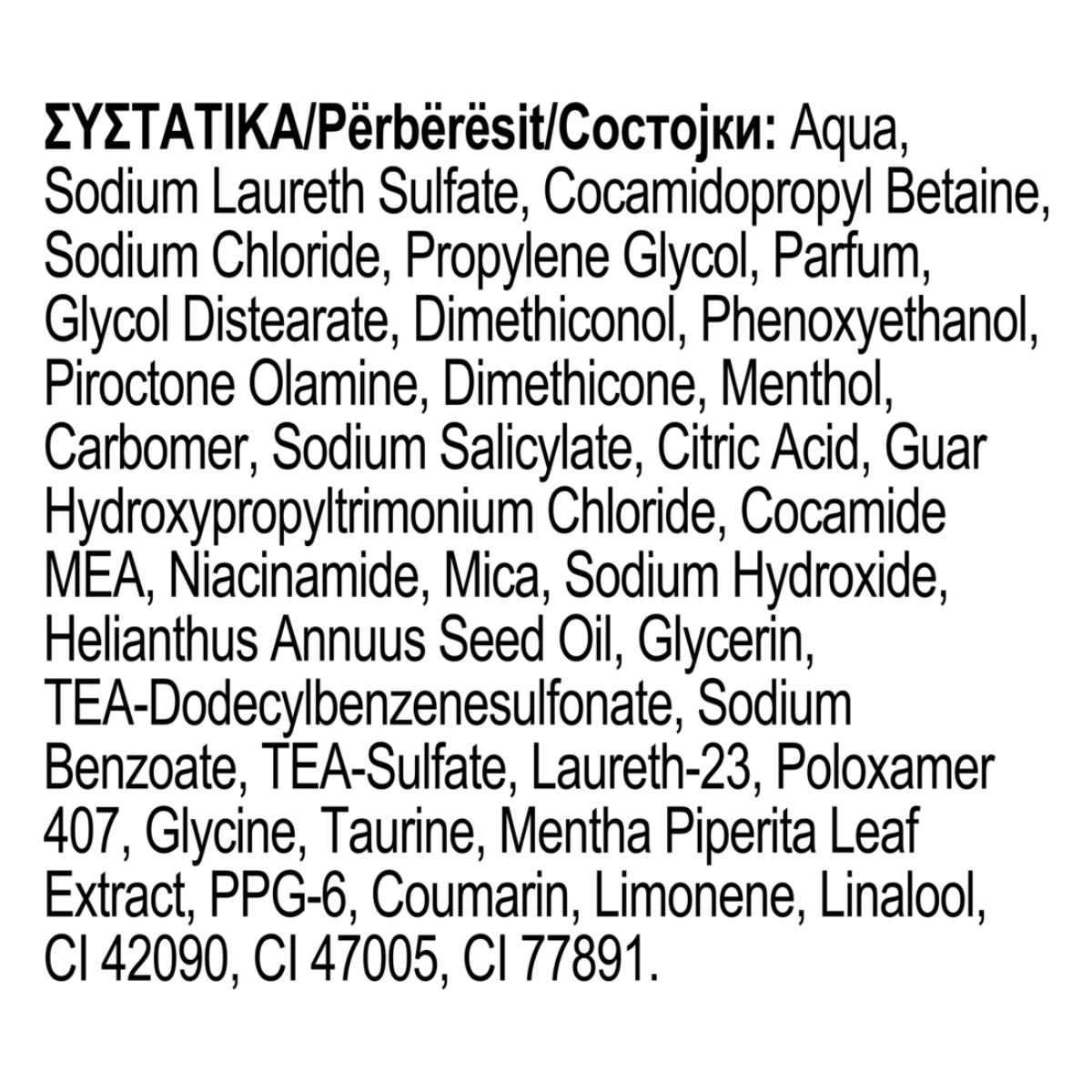 Aqua, Sodium Laureth Sulfate, Cocamidopropyl Betaine, Sodium Chloride, Propylene Glycol. Parum, Glycol Distearate, Dimethiconol,Phenoxyethanol, Piroctone Olamine, Dimethicone, Menthol, Carbomer, Sodium Salicylate, Citric Acid, Guar Hydroxypropyltrimonium Chloride, Cocamide MEA, Sodium Hydroxide, Helianthus Annuus Seed Mica, Oil, Glycerin, TEA-Dodecylbenzenesulfonate, Sodium Benzoate, TEA-Sulfate, Laureth-23, Poloxamer 407, Glycine, Niacinamide, Taurine, Mentha Piperita Leaf Extract, PPG-6, Coumarin Limonene, Linalool, CI 42090, C 47005, CI 77891.