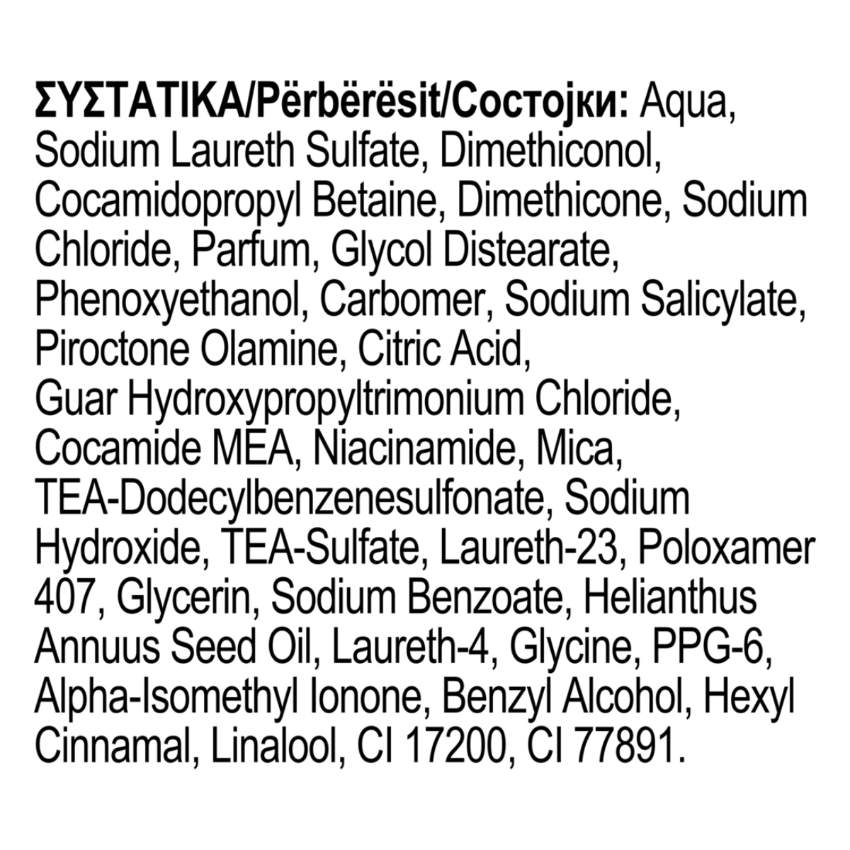 Aqua, Sodium Laureth Sulfate, Cocamidopropyl Betaine, Dimethiconol, Helianthus Annuus Seed Oil, Hydrolyzed Collagen, Lysine HCl, Panthenol, Pantolactone, Pyridoxine HCl, Sodium Ascorbyl Phosphate, Tocopheryl Acetate, Carbomer, Cellulose Gum, Citric Acid, Cyclotetrasiloxane, Dimethicone, Ethylhexyl Methoxycinnamate, Glycerin, Guar Hydroxypropyltrimonium Chloride, Laureth-23, Laureth-4, Parfum, PEG-4, Poloxamer 407, PPG-12, Sodium Chloride, Sodium Hydroxide, Sodium Polynaphthalenesulfonate, TEA-Dodecylbenzenesulfonate, TEA-Sulfate, Xanthan Gum, Zinc Pyrithione, Zinc sulfate, DMDM Hydantoin, Methylchloroisothiazolinone, Methylisothiazolinone, Sodium Benzoate, Benzyl Alcohol, Butylphenyl Methylpropional, Hexyl Cinnamal, Linalool, CI 17200.