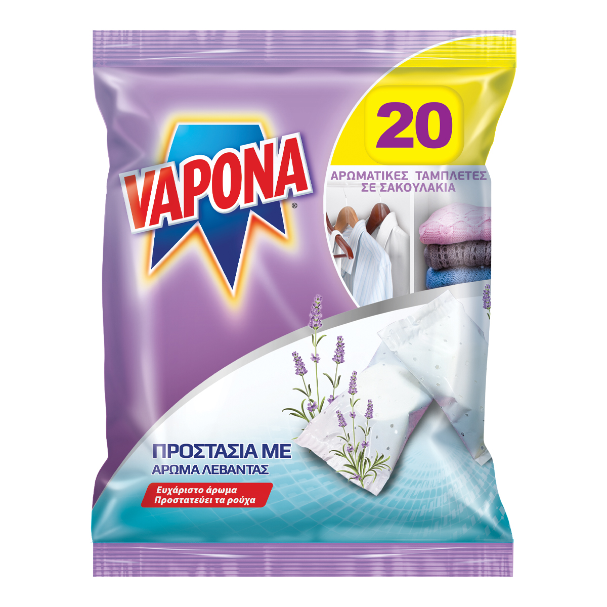 Οι Vapona ταμπλέτες σε σακουλακια με άρωμα λεβάντας προστατεύουν τα αγαπημένα σας ρούχα όλη τη σεζόν, αφήνοντας ένα απαλό άρωμα λεβάντας στην ντουλάπα σας. Χρησιμοποιήστε τις σε μόνιμη βάση ή κατά την εποχιακή ανανέωση των ρούχων σας. Ιδανικές για συτρτάρια, χαρίζουν ένα δροσερό άρωμα. Για μέγιστη αποτελεσματικότητα για την προστασία των ρούχων σας από το σκόρο για ολόκληρη σεζόν (6 μήνες).
