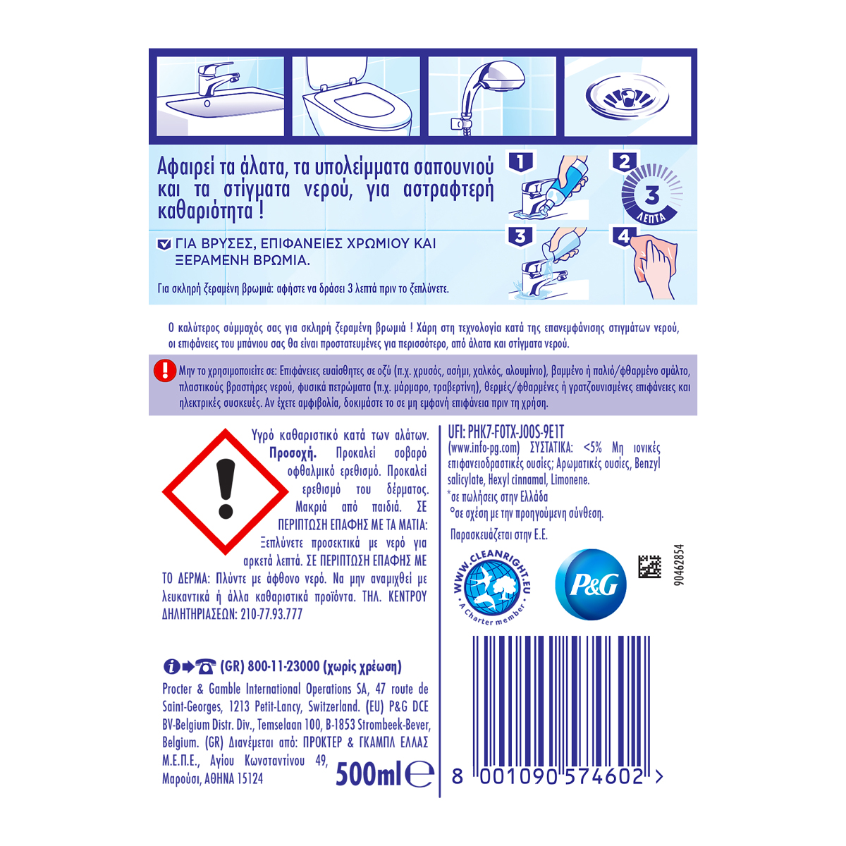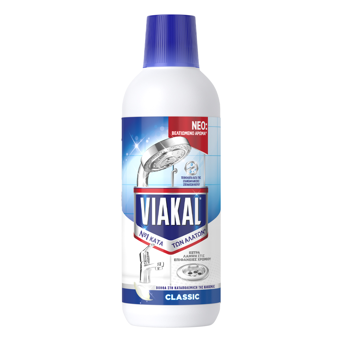 Το Viakal Classic Υγρό, όχι μόνο αφαιρεί τα άλατα, τα υπολείμματα σαπουνιού και τα στίγματα νερού, αλλά επιπλέον αποτρέπει την επανεμφάνιση των αλάτων χάρη στην τεχνολογία anti-droplet. Ιδανικό για τα πιο σκληρά άλατα, χαρίζει περισσότερη λάμψη στις επιφάνειες χρωμίου. Η ειδική του σύνθεση δημιουργεί ένα φράγμα που εμποδίζει την επανεμφάνιση των στιγμάτων νερού, ακόμα και σε περιοχές με σκληρό νερό. Επειδή η σύνθεσή του σέβεται τις επιφάνειές σας, μπορεί να χρησιμοποιείται καθημερινά.