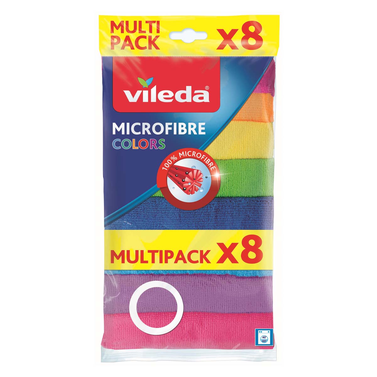 Η πετσέτα μικροϊνών Vileda Colors 8 τεμαχίων χρησιμοποιείται υγρή ή στεγνή. Καθαρίζει εύκολα ακόμα και τους πιο επίμονους και λιπαρούς λεκέδες χωρίς την χρήση καθαριστικών και είναι ιδανική για όλες τις επιφάνειες χωρίς να αφήνει ίχνη. Κάθε συσκευασία περιέχει 4 χρώματα για να επιλέξετε διαφορετικό χρώμα ανάλογα με τη χρήση. Πλένεται στο πλυντήριο ή στο χέρι έως τους 60° βαθμούς. Με 100% μικροΐνες που απομακρύνουν πάνω από το 99% των βακτηρίων μόνο με νερό (έρευνα από ανεξάρτητο, διαπιστευμένο ινστιτούτο μικροβιολογίας και ανοσολογίας).
