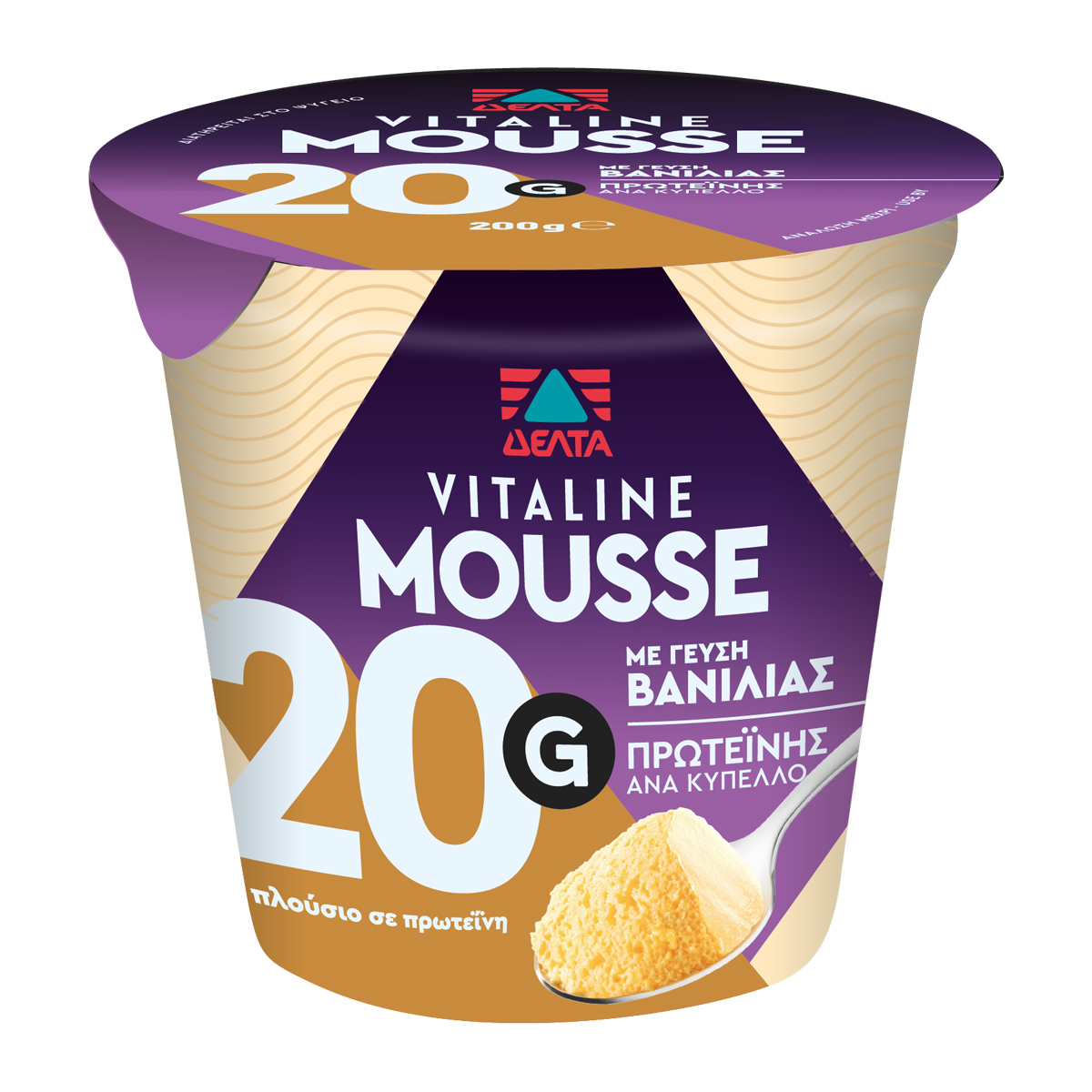 Mousse επιδόρπιο, γάλακτος με γεύση Βανίλιας, υψηλής περιεκτηκότητας σε πρωτεΐνη με γλυκαντικά.