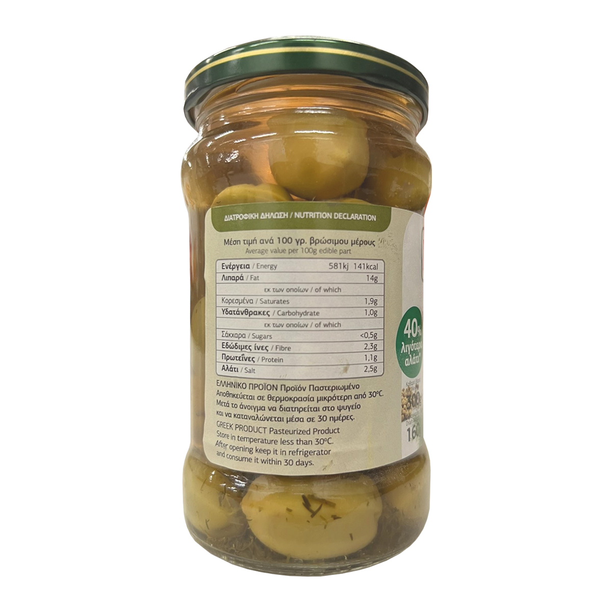 *Λιγότερη% αλατοπεριεκτικότητα σε σύγκριση με την αντίστοιχη του προϊόντος XENIA 'Ελιές Πράσινες σε άλμη' 355gr.