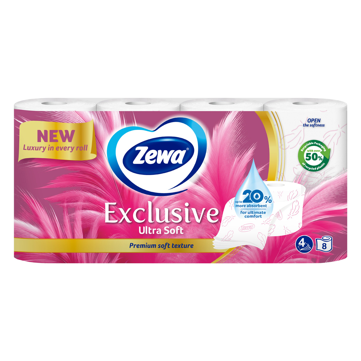 Η πουπουλένια υφή αυτού του απαλού τετράφυλλου χαρτιού αγγίζει εξαιρετικά απαλά το δέρμα ενώ ταυτόχρονα είναι εξαιρετικά ανθεκτικό. Το Zewa Exclusive Ultra Soft κυκλοφορεί σε λευκό χρώμα με ροζ διακοσμητικό σχέδιο. Τώρα σε νέα συσκευασία με πρακτική λαβή για να διευκολύνει τη μεταφορά και ξεχωριστό design που αναδεικνύει το υψηλό επίπεδο φροντίδας Zewa.