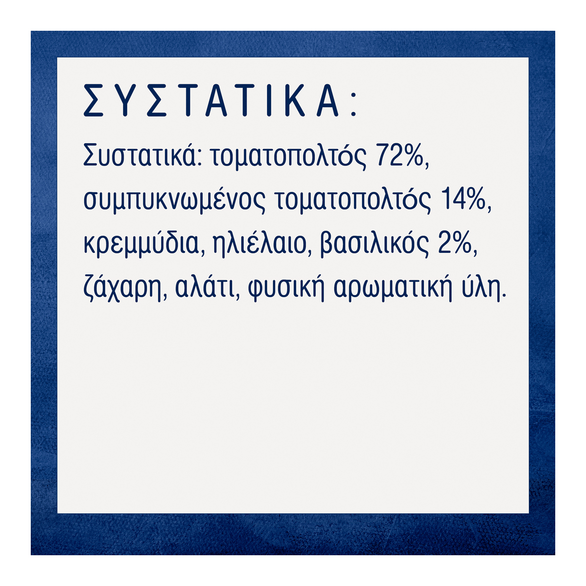 Τοματοπολτoς 72%, συμπυκνωμένος τοματοπολτoς 14%, κρεμμύδια, ηλιέλαιο, βασιλικός 2%, ζάχαρη, αλάτι, φυσική αρωματική ύλη.