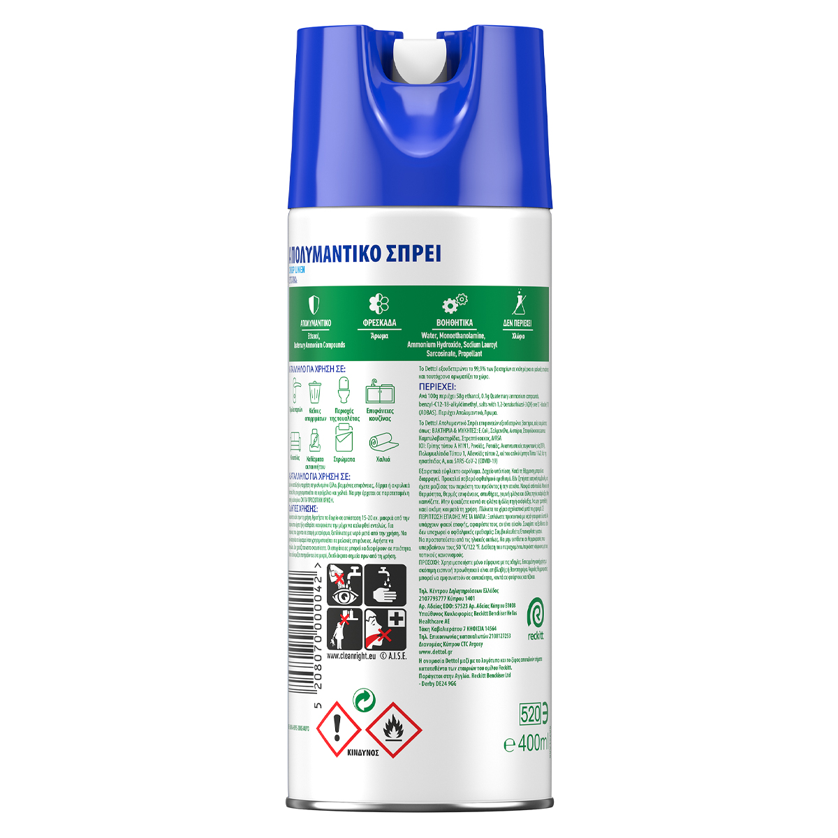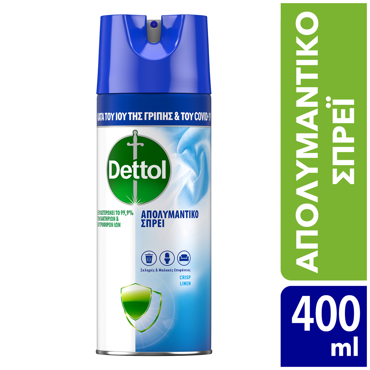 Tο Απολυμαντικό spray Dettol μπορεί να σας βοηθήσει να προστατέψετε την οικογένειά σας από μικρόβια συμβάλλοντας στην πρόληψη των επιβλαβών βακτηρίων και ιών. Η μοναδική σύνθεση του Dettol αποδεδειγμένα εξουδετερώνει το 99,9% των βακτηριδίων και ιών συμπεριλαμβανομένων των E. coli, της σαλμονέλας και του ιού της γρίπης στις επιφάνειες με τις οποίες έρχεστε σε επαφή καθημερινά, όπως οι χειρολαβές των θυρών, οι κάδοι στην κουζίνα και οι χώροι της τουαλέτας.Κατάλληλο για:Χρήση σε υφάσματα ή καναπέδες. Στο μπάνιο,στη κουζίνα ,στον εξοπλισμό του μωρού ή των κατοικιδίων.