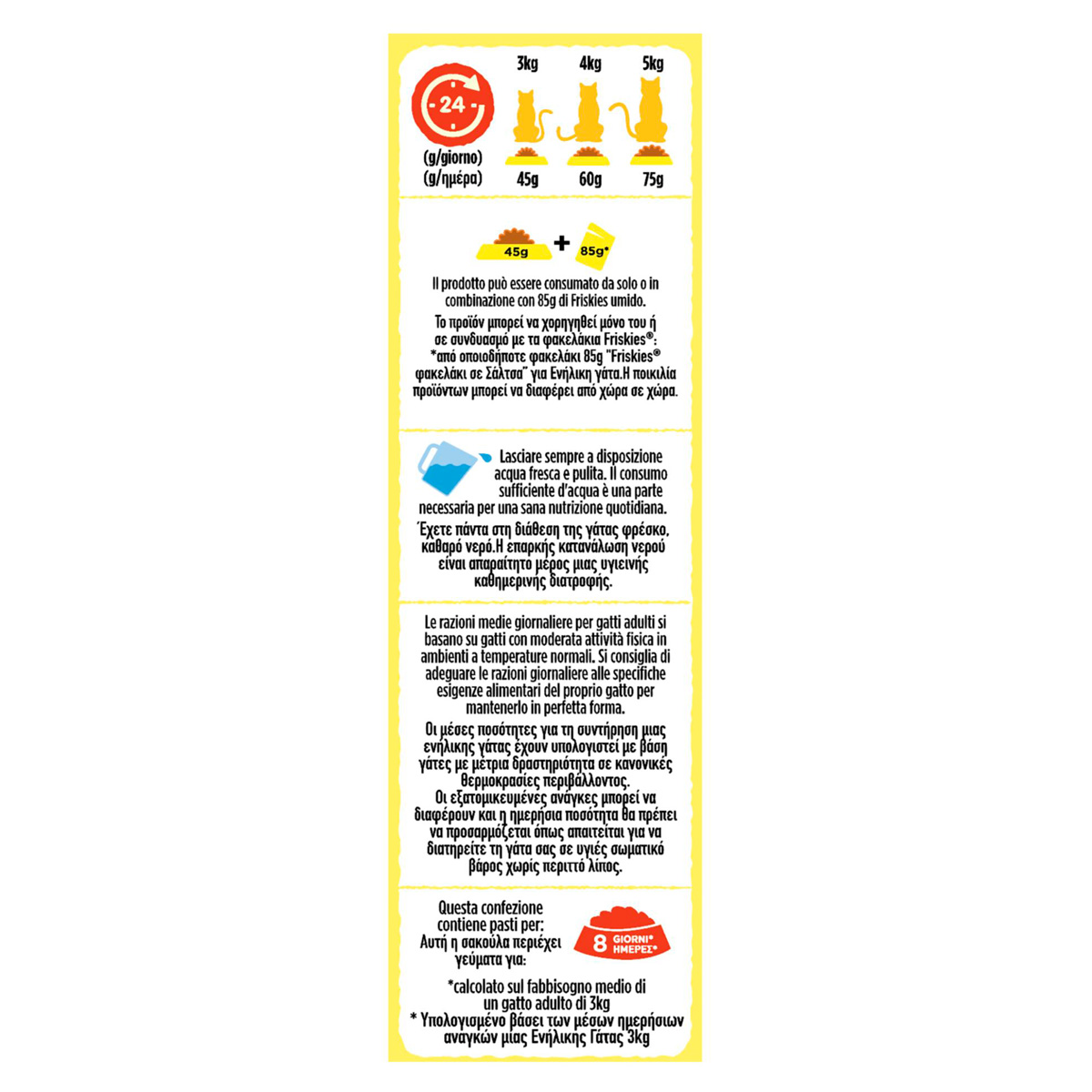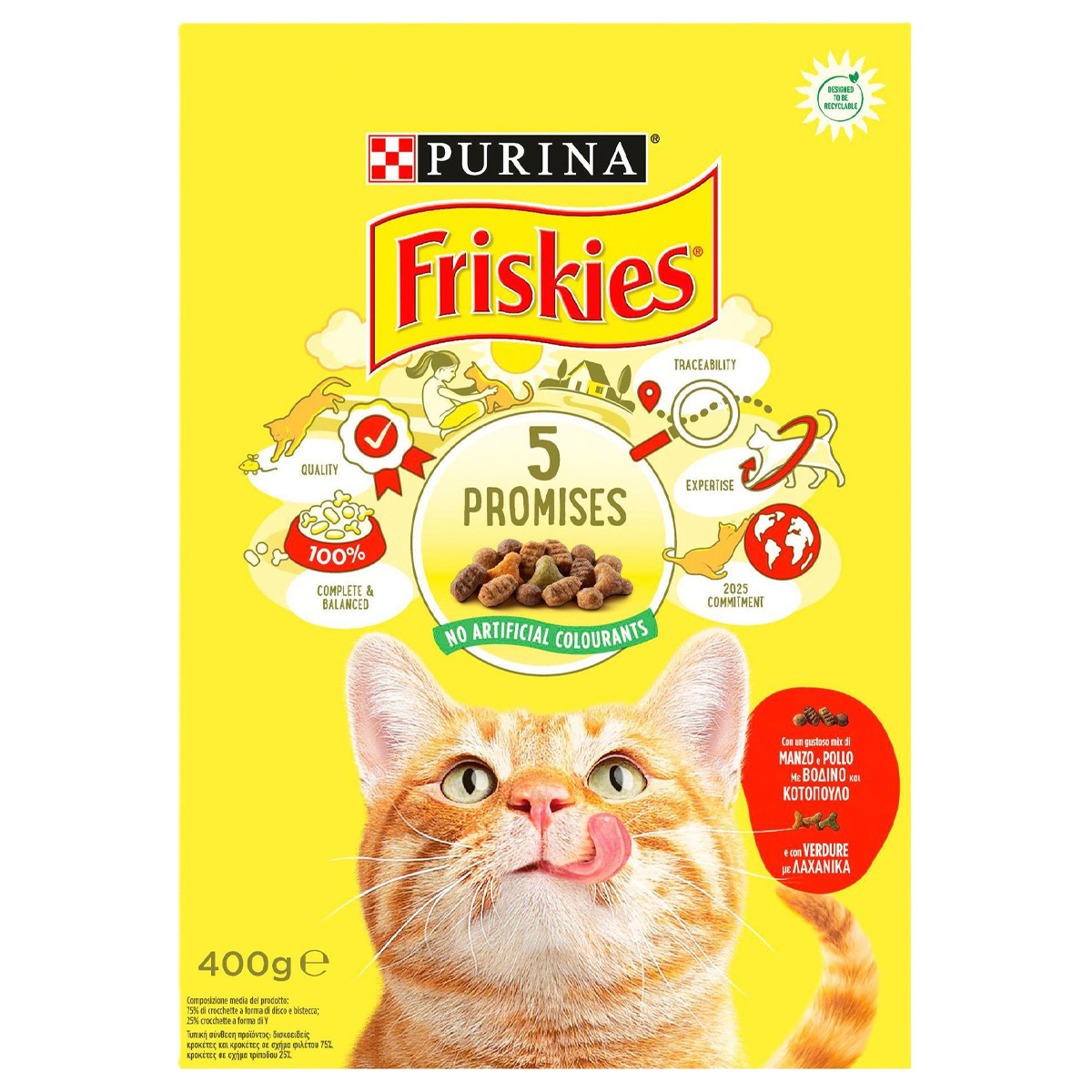 Ξηρή Τροφή Γάτας Friskies Βοδινό και Κοτόπουλο με Λαχανικά 400g. Οι γάτες είναι εξερευνητές από τη φύση τους, αντιλαμβάνονται τα πάντα στο περιβάλλον τους. Αυτό είναι που τις κάνει τόσο γοητευτικά και ενεργά μέλη της οικογένειας. Γι' αυτό οι ειδικοί της Purina® έχουν δημιουργήσει τα Friskies® για ενήλικες γάτες: νόστιμη, ποιοτική τροφή για γάτες, που θρέφει το αστείρευτο ενδιαφέρον του εξερευνητή σας για τον κόσμο. Χωρίς Πρόσθετες Τεχνητές Χρωστικές, Αρωματικές ύλες ή Συντηρητικά. Τα Friskies® διατρέφουν γάτες με σωστή, υγιεινή τροφή για δεκαετίες. Γεμίζουμε χιλιάδες μπωλ και αυτή η τιμή συνοδεύεται από τεράστια ευθύνη. Γι' αυτό οι συνταγές Friskies® παρασκευάζονται χωρίς πρόσθετες τεχνητές χρωστικές, αρωματικές ύλες ή συντηρητικά. Για να μπορείτε να συνεχίσετε να τις διατρέφετε με την ίδια νόστιμη τροφή που αγαπούν και να νιώθετε περήφανοι γι' αυτό.