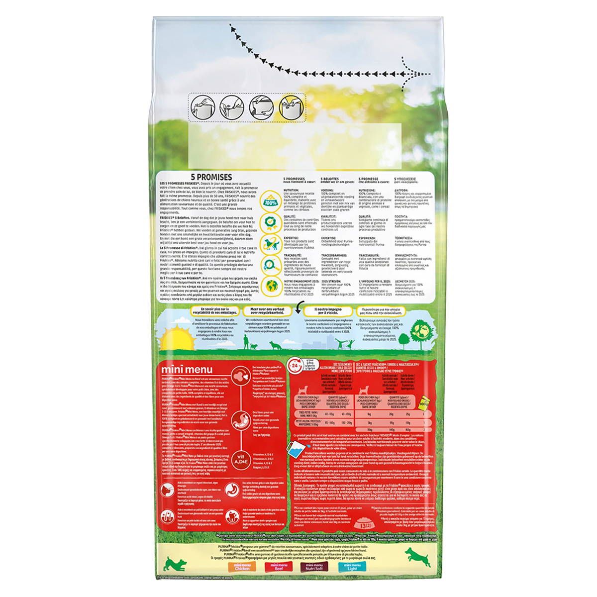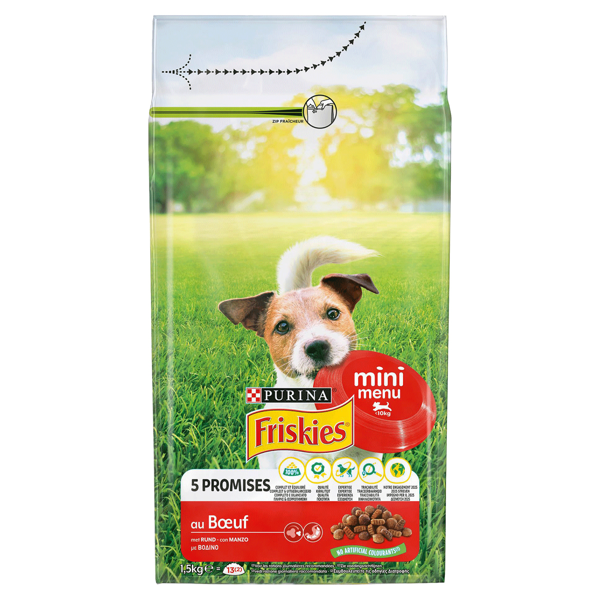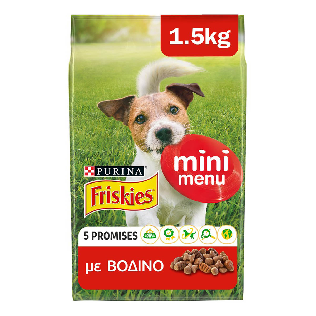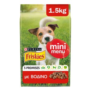 Friskies Mini Menu Ξηρή τροφή για ενήλικους Μικρόσωμους Σκύλους. Το PURINA® Friskies Mini Menu με Βοδινό είναι μια γευστική συνταγή με βοδινό, συνδυασμένη με δημητριακά ολικής άλεσης, βιταμίνες Β και Ωμέγα 3 & 6 λιπαρά οξέα. Το Friskies Mini Menu είναι ένα γευστικό γεύμα ειδικά σχεδιασμένο για το μικρόσωμο σκύλο σας με μικρότερες κροκέτες. Είναι 100% πλήρης και ισορροπημένη και παρασκευασμένη με ποιοτικά συστατικά και φυτικές ίνες για υγιή πέψη.