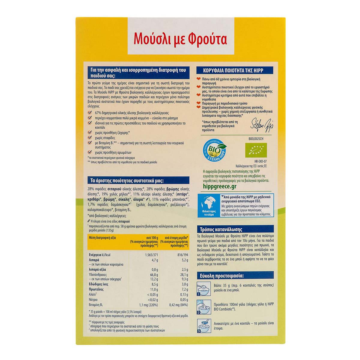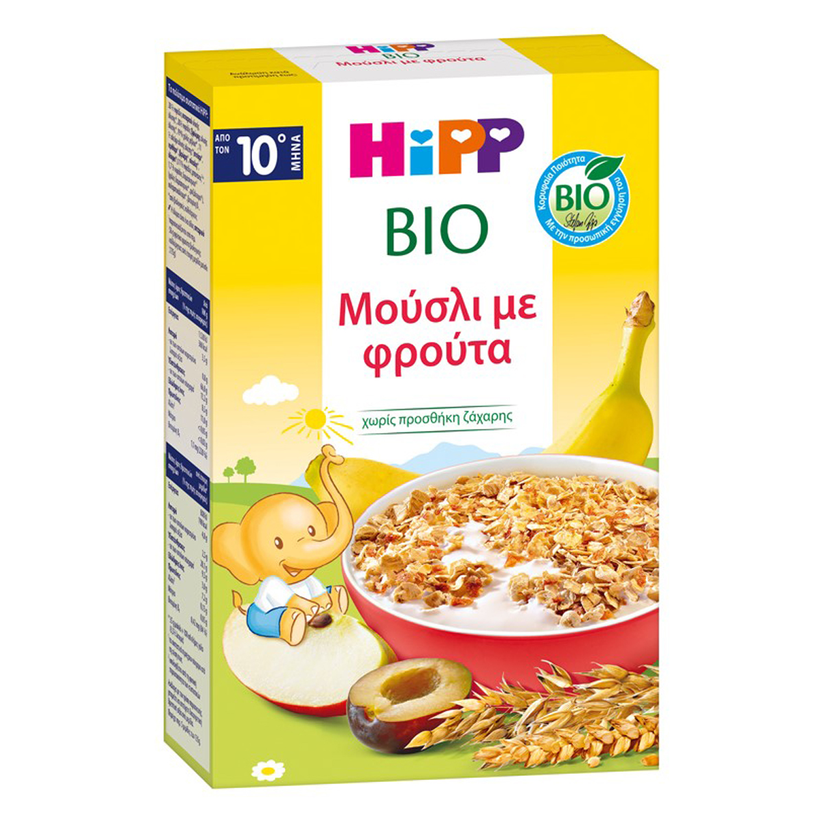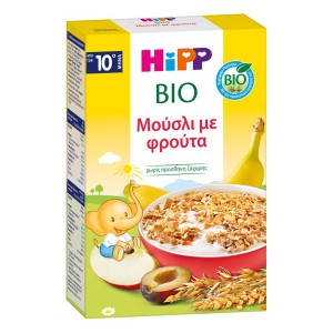 Τα βιολογικά Μούσλι με φρούτα HiPP περιέχουν πολύτιμα βιολογικά συστατικά όπου δίνουν ενέργεια και εξασφαλίζουν ένα ισορροπημένο και υγιεινό πρωινό για τα παιδιά από τον 10ο μήνα. Βασιμένα σε δημητριακά ολικής άλεσης βιολογικής καλλιέργειας. Με βιταμίνη Β1 απαραίτητη για την καλή λειτουργία του νευρικού συστήματος. Με κομματάκια πολύ μικρά κομμένα- εύκολα στο μάσημα. Χωρίς προσθήκη ζάχαρης. Χωρίς σταφίδες. Καταναλώστε τα με γάλα ή μέσα στο γιαούρτι.