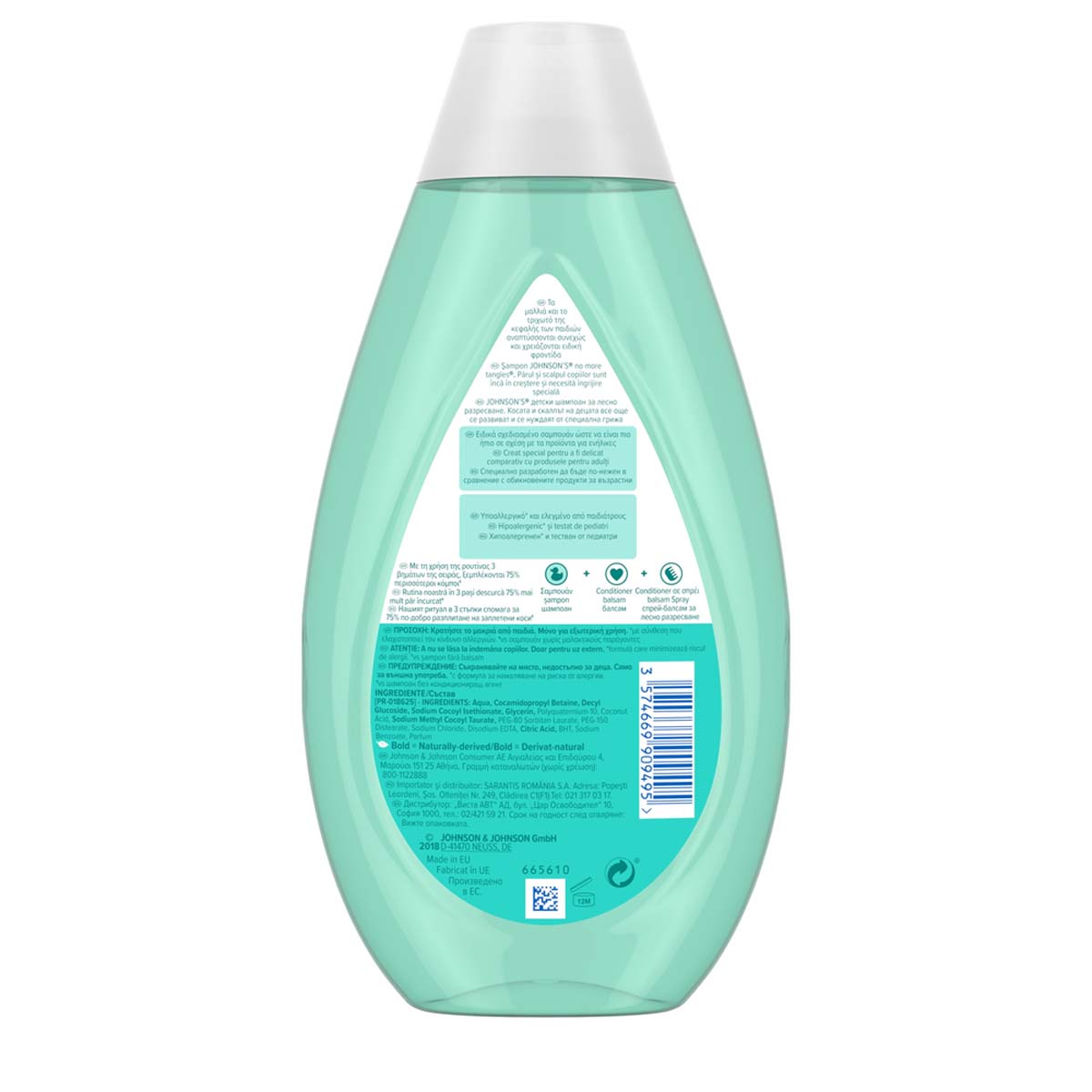 To Johnson's® No More Tangles Kids Shampoo 500 ml ξεμπλέκει τους κόμπους στη διάρκεια του μπάνιου, αφήνοντας τα μαλλιά καθαρά, λεία και απαλά. Υποαλλεργικό**, με ισορροπημένο pH για την επιδερμίδα. Ελεγμένο από παιδίατρους και δερματολόγους. Χωρίς χρωστικές ουσίες, parabens, φθαλικές ενώσεις, θειικά άλατα, αλκοόλη και σαπούνι. Η σύνθεση ΟΧΙ ΠΙΑ ΔΑΚΡΥΑ® είναι το ίδιο απαλή για τα μάτια όπως το καθαρό νερό, προσφέροντας ξέγνοιαστες στιγμές στο μπάνιο. H ρουτίνα περιποίησης 3 βημάτων ξεμπλέκει 75% περισσότερους κόμπους. Εύκολο χτένισμα ακόμη και για τα πιο μακριά ή σγουρά μαλλιά.Καθώς το παιδί σας μεγαλώνει, οι ανάγκες των μαλλιών του αλλάζουν. Τα προϊόντα μας για την περιποίηση μαλλιών έχουν πιο ήπια σύνθεση σε σχέση με τα κανονικά προϊόντα για ενήλικες, αλλά και ορισμένες μοναδικές ιδιότητες. Κερδίστε τη μάχη ενάντια στους κόμπους, με το Johnson's® No More Tangles® Kids Shampoo. Χάρη στην ειδική του σύνθεση για νήπια και παιδιά καθαρίζει και ξεμπλέκει τα μαλλιά, αφαιρώντας ακόμα και του