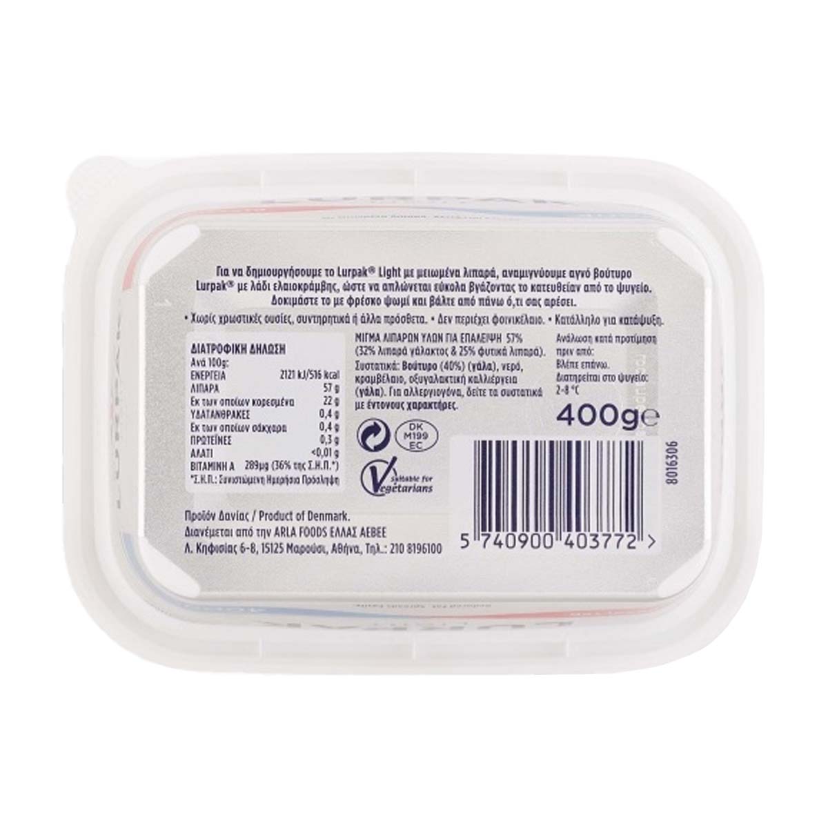 To Lurpak Light Ανάλατο που αλείφεται εύκολα, είναι η ιδανική επιλογή για όσους ακολουθούν μία διατροφή με μειωμένα λιπαρά αλλά παράλληλα δεν συμβιβάζονται στην γεύση. Συνδυάζοντας τα καλύτερα χαρακτηριστικά, απολαμβάνετε τη γεύση του Lurpak® που αγαπάτε, αλλά με 25% λιγότερα λιπαρά από το Lurpak® Soft. Και μπορείτε να το αλείψετε απευθείας από το ψυγείο, κάτι που το καθιστά ιδανικό για γρήγορα, υπέροχα πρωινά και σάντουιτς, χαμηλά σε θερμίδες.