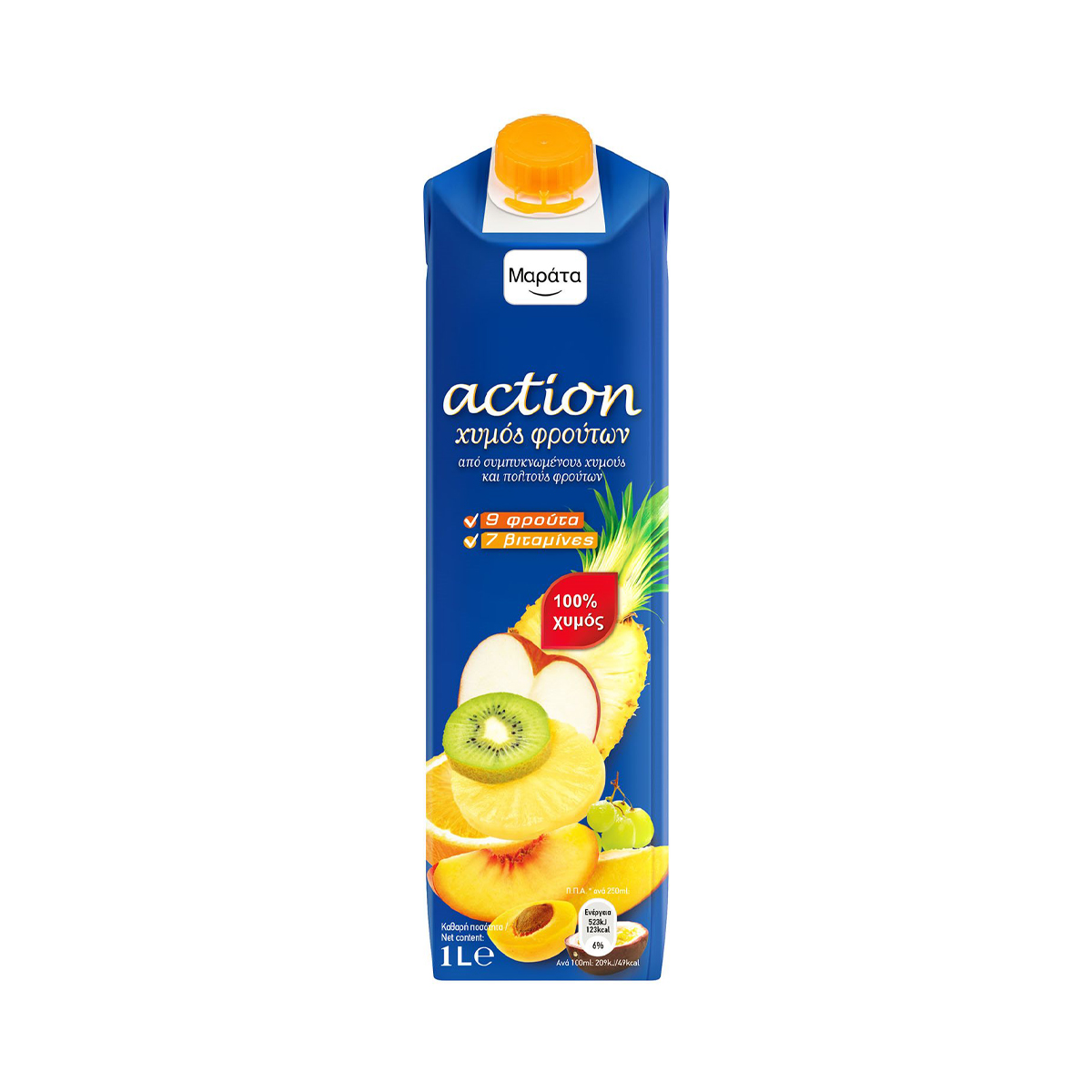 Απολαύστε το χυμό Μαράτα με υπέροχη γεύση και βιταμίνες από 9 φρούτα - μήλο, σταφύλι, πορτοκάλι, ακτινίδιο, πάσιον, μάνγκο, ανανά, ροδάκινο και βερίκοκο! Με φυσικά σάκχαρα, χωρίς πρόσθετα σάκχαρα.