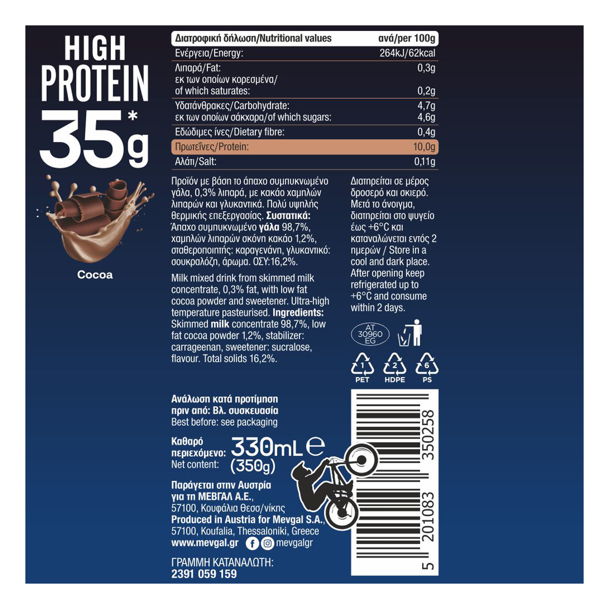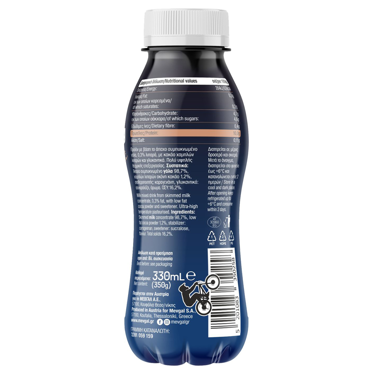 Προϊόν με βάση το άπαχο συμπυκνωμένο γάλα, 0,3% λιπαρά, με κακάο χαμηλών λιπαρών και γλυκαντικά. Πολύ υψηλής θερμικής επεξεργασίας. 35g πρωτεΐνη ανά συσκευασία.