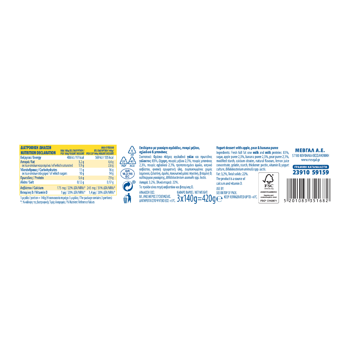 Φρέσκο πλήρες αγελαδινό ΓΑΛΑ και πρωτεΐνες ΓΑΛΑΚΤΟΣ 83%, ζάχαρη, πουρές μήλου 2,3%, πουρές μπανάνας 2,3%, πουρές αχλαδιού 2,3%, τροποποιημένο άμυλο, κιτρικό ασβέστιο, φυσική αρωματική ύλη, συμπυκνωμένος χυμός λεμονιού, ζελατίνη, άμυλο, πυκνωτικό μέσο: πηκτίνη, βιταμίνη D, καλλιέργεια γιαούρτης. Λιπαρά 3,2%, Ολικά στερεά: 22%. To προϊόν είναι πηγή ασβεστίου και βιταμίνης D.