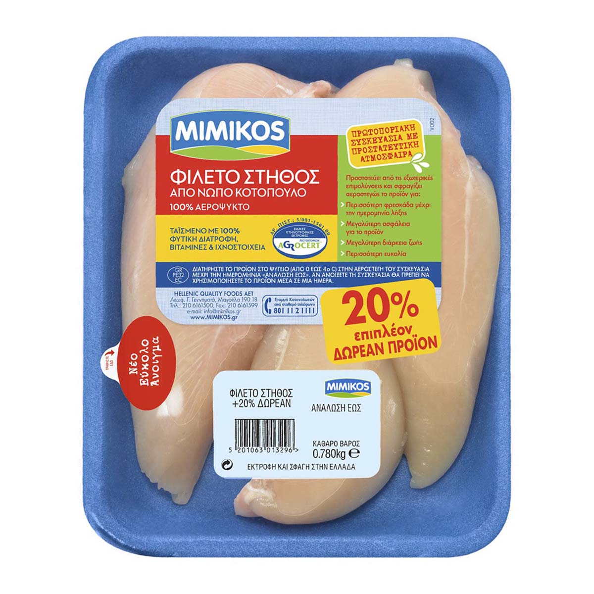 Στήθος κοτόπουλου μεγαλωμένου με το σύστημα MIMIKOS. Τα κοτόπουλα MIMIKOS έχουν τραφεί με 100% φυτικές τροφές, βιταμίνες και ιχνοστοιχεία και πιστοποιούνται από τον AGROCERT για την ειδική αυτή εκτροφή.