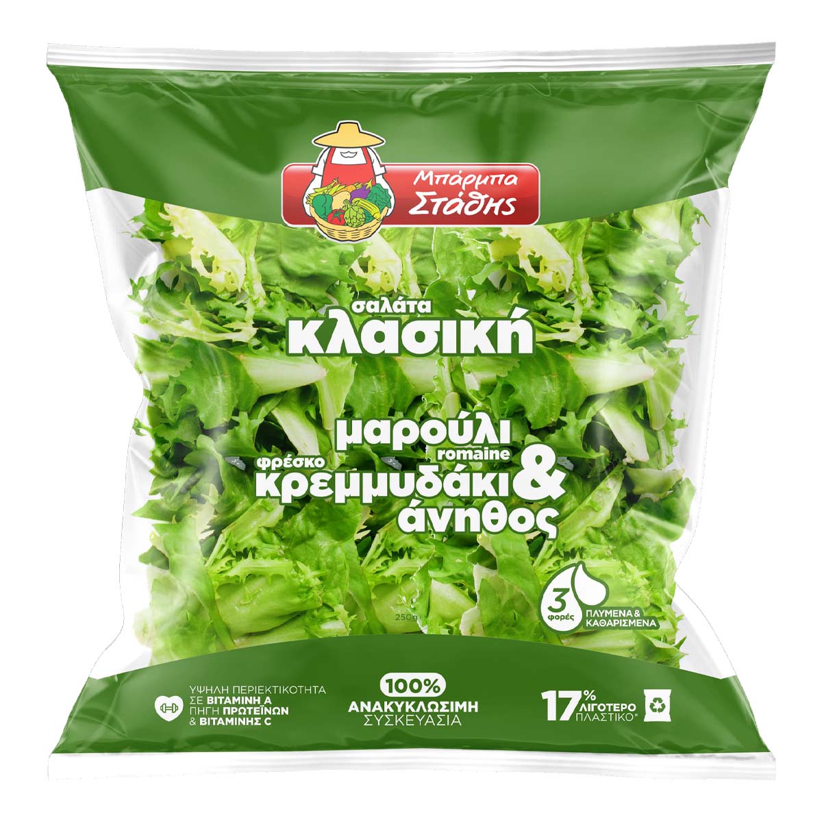 H σαλάτα Κλασική Μπάρμπα Στάθης με μαρούλι romaine, φρέσκο κρεμμυδάκι και άνηθο, έρχεται να προσθέσει απόλαυση σε κάθε σας γεύμα. Αγαπημένη πρόταση για κυρίως γεύμα ή συνοδευτικό, η φρέσκια σαλάτα Κλασική, είναι τρεις φορές πλυμένη, φρεσκοκομμένη και έτοιμη για σερβίρισμα.Έχει υψηλή περιεκτικότητα σε βιταμίνη Α, ενώ ταυτόχρονα είναι πηγή πρωτεϊνών και βιταμίνης C.