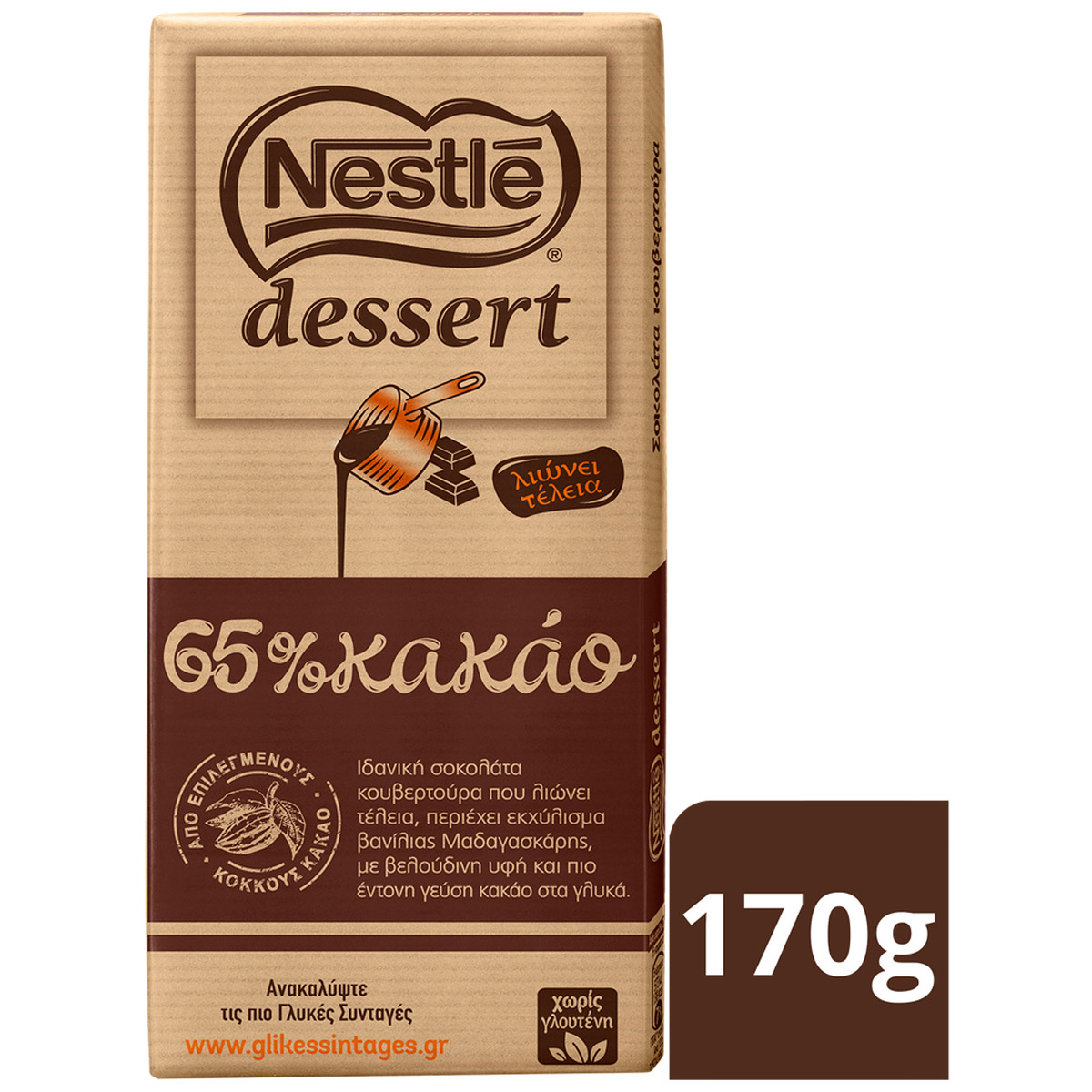 ΚΟΥΒΕΡΤΟΥΡΑ NESTLE® DESSERT 65% ΚΑΚΑΟ Iδανική σοκολάτα κουβερτούρα που λιώνει τέλεια με πλούσιο άρωμα, φυσικό εκχύλισμα βανίλιας Μαδαγασκάρης και βελούδινη υφή, για πιο έντονη γεύση κακάο στα γλυκά σας. Για πιο έντονη γεύση κακάο στα γλυκά σας και με εκχύλισμα φυσικής βανίλιας, με την κουβερτούρα NESTLE DESSERT 65% Κακάο η δημιουργία των πιο σοκολατένιων γλυκών θα είναι παιχνιδάκι. Παρασκευάζεται από επιλεγμένες ποικιλίες κακάο αλλά και από τα πιο αγνά υλικά, όπως είναι το φυσικό εκχύλισμα βανίλιας. Περιέχει 100% βούτυρο του κακάο (χωρίς χρήση επιπλέον φυτικών λιπαρών) για να σας προσφέρει άριστη ποιότητα. Έχει τέλεια γεύση, πλούσιο άρωμα και βελούδινη υφή. Σας προσφέρει αμέτρητες δυνατότητες για να εμπνευστείτε, για να δημιουργήσετε τα πιο επιτυχημένα γλυκά και να εντυπωσιάσετε και τους πιο απαιτητικούς λάτρεις της σοκολάτας.