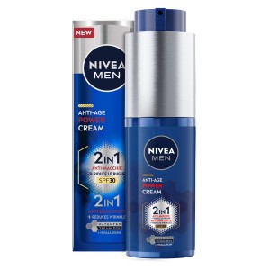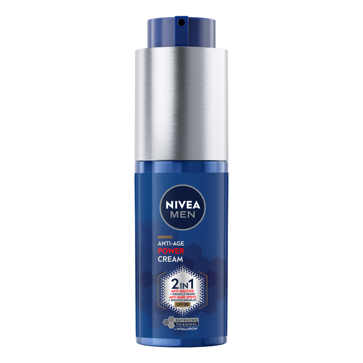 Η NIVEA MEN Anti-Age Power Ενυδατική Κρέμα Προσώπου συνδυάζει το πατενταρισμένο συστατικό Thiamidol® και την Hyaluron στοχεύοντας αποτελεσματικά τις σκούρες κηλίδες, ενώ παράλληλα παρέχει αντηλιακή προστασία SPF30 και προστασία κατά της γήρανσης. Αυτή η καινοτόμος σύνθεση, που αναπτύχθηκε μετά από 10 χρόνια έρευνας, μειώνει ορατά την εμφάνιση και το μέγεθος των σκούρων κηλίδων και αποτρέπει την επανεμφάνισή τους, χαρίζοντας στην επιδερμίδα μια πιο λεία και νεανική όψη. Η ελαφριά υφή της είναι ειδικά σχεδιασμένη για την ανδρική επιδερμίδα, προσφέροντας εύκολη εφαρμογή χωρίς λιπαρά υπολείμματα. Δερματολογικά ελεγμένη, αυτή η ενυδατική κρέμα ενισχύει τη λάμψη της επιδερμίδας και βελτιώνει ορατά την όψη της μέσα σε 4 εβδομάδες για ισχυρή καθημερινή φροντίδα: Ενυδατική κρέμα NIVEA MEN Anti-Age Power Moisturizer.