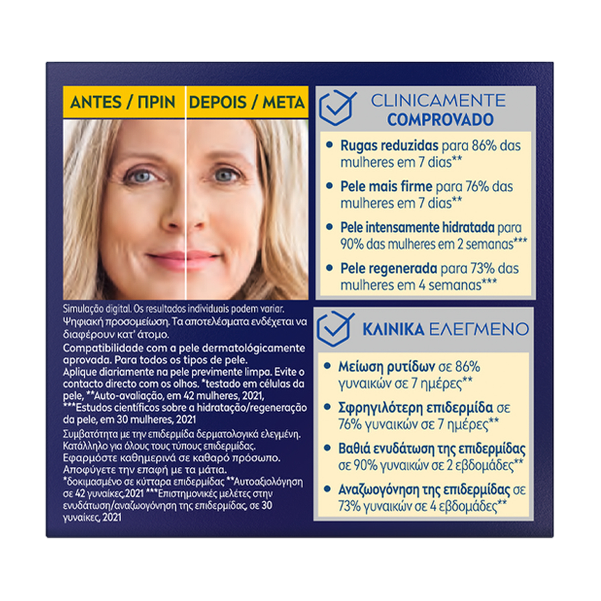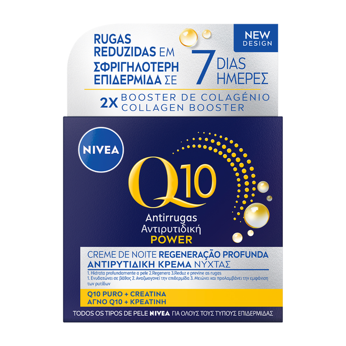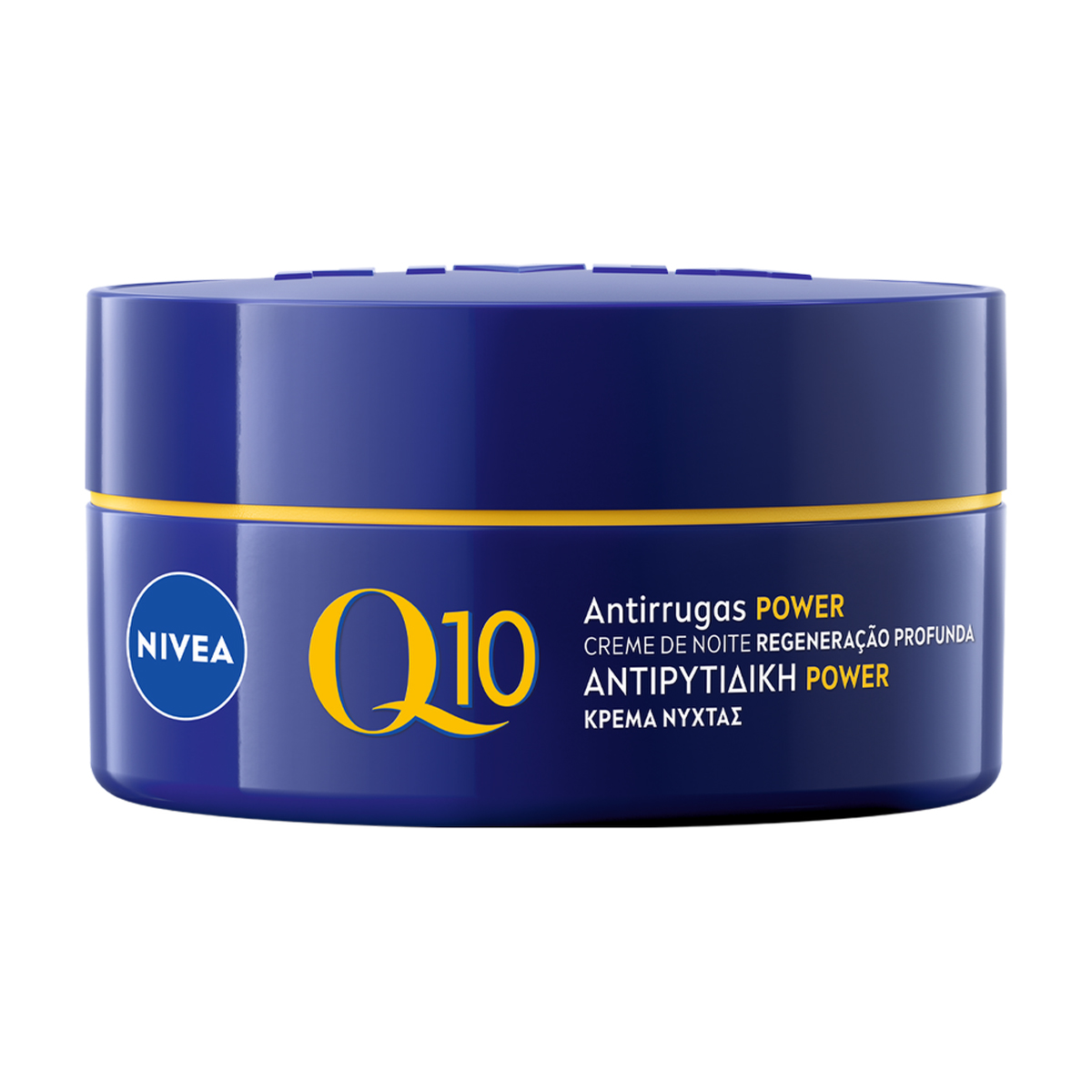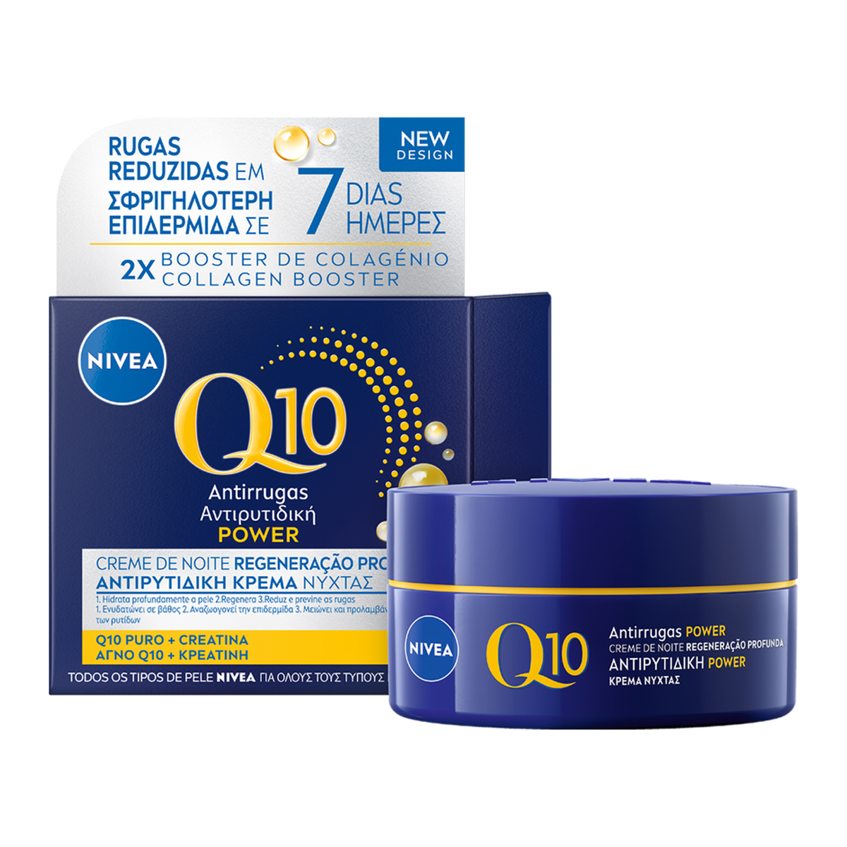 Η NIVEA Q10 Power Αντιρυτιδική Κρέμα Νύχτας είναι εμπλουτισμένη με 100% Skin identical Q10 διπλής δράσης. Η βελτιωμένη σύνθεση εξασφαλίζει 24ωρη αντιρυτιδική δράση για την προστασία των κυττάρων της επιδερμίδας από τις βλάβες από τις ελεύθερες ρίζες και τους εξωτερικούς επιθετικούς παράγοντες. Η καινοτόμος σύνθεση βοηθά στην αναγέννηση της επιδερμίδας ενώ κοιμάστε και ενισχύει την παραγωγή κολλαγόνου*. Έχει αναπτυχθεί ειδικά για να μειώνει 3 τύπους ρυτίδων: ρυτίδες στο μέτωπο κατά 27%**, στο πόδι της χήνας κατά 15%**, στις ρυτίδες της περιοχής των μάγουλων και του στόματος κατά 11%**. Μετά από 24 ώρες: η επιδερμίδα σας θρέφεται έντονα *. Μετά από 1 εβδομάδα: Η επιδερμίδας σας είναι ορατά πιο σφριγηλή κατά 23% με μειωμένες ρυτίδες. Μετά από 4 εβδομάδες: περαιτέρω μειωμένες ρυτίδες***.