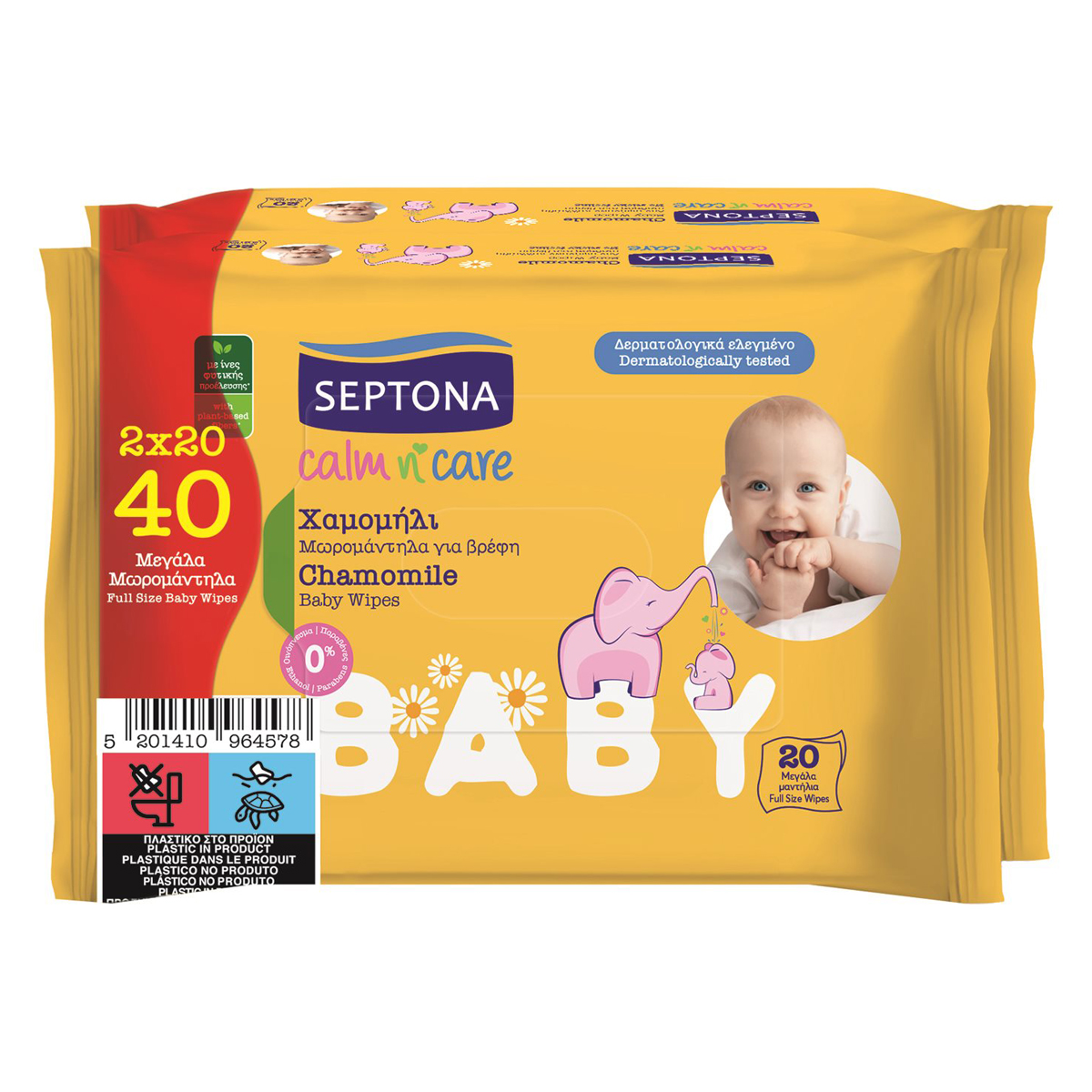 Septona Calm N' Care Μωρομάντηλα Χαμομήλι 2 x 20 Τεμάχια