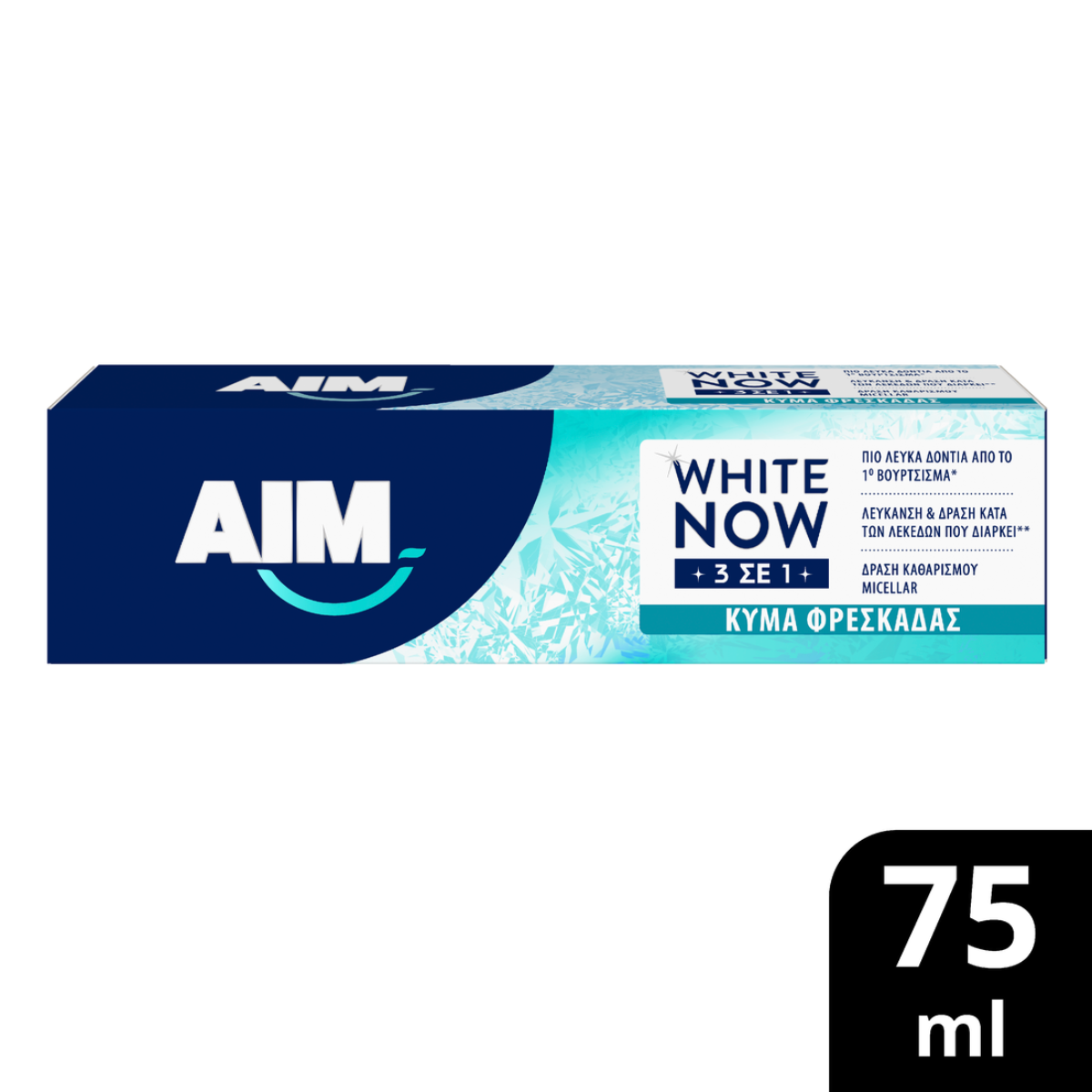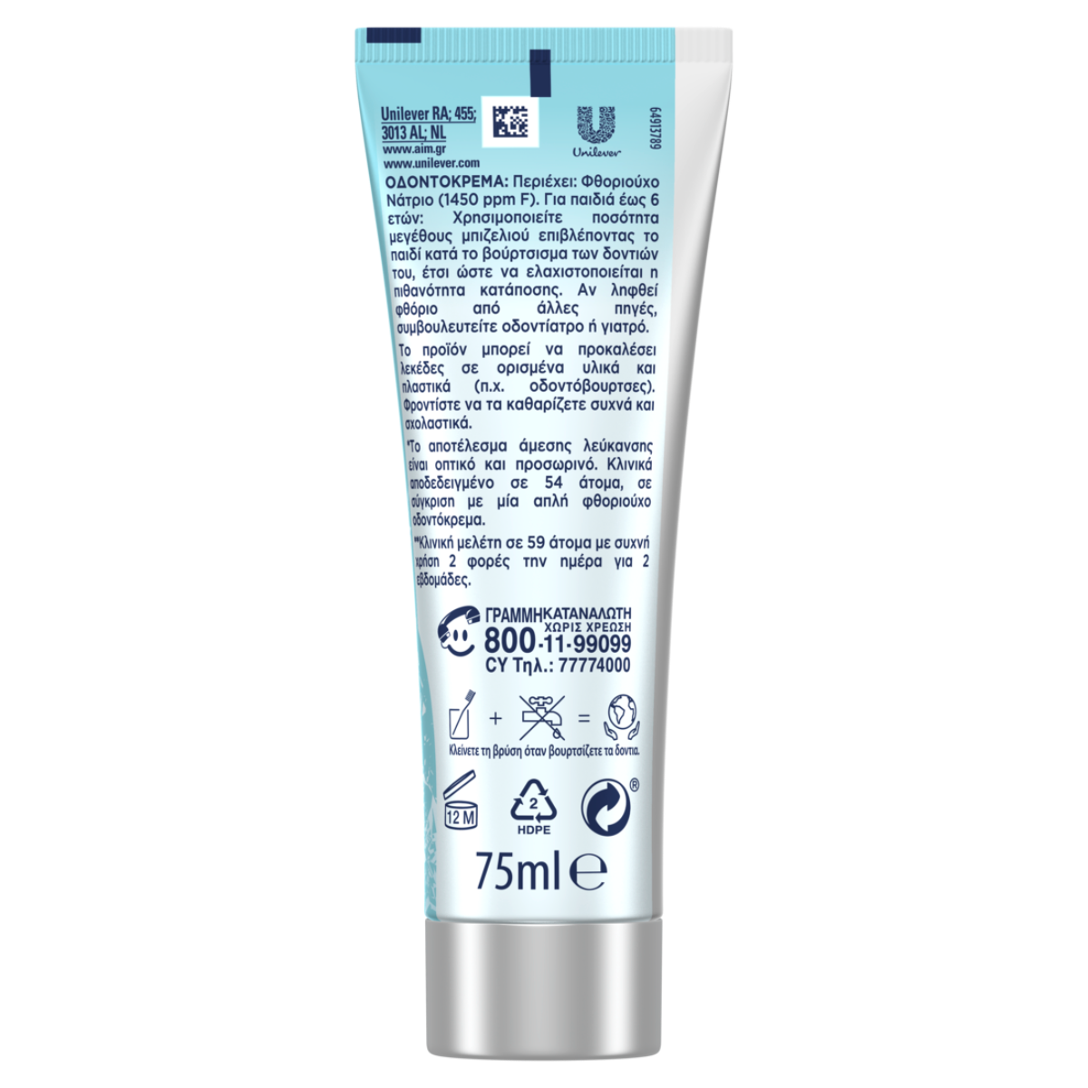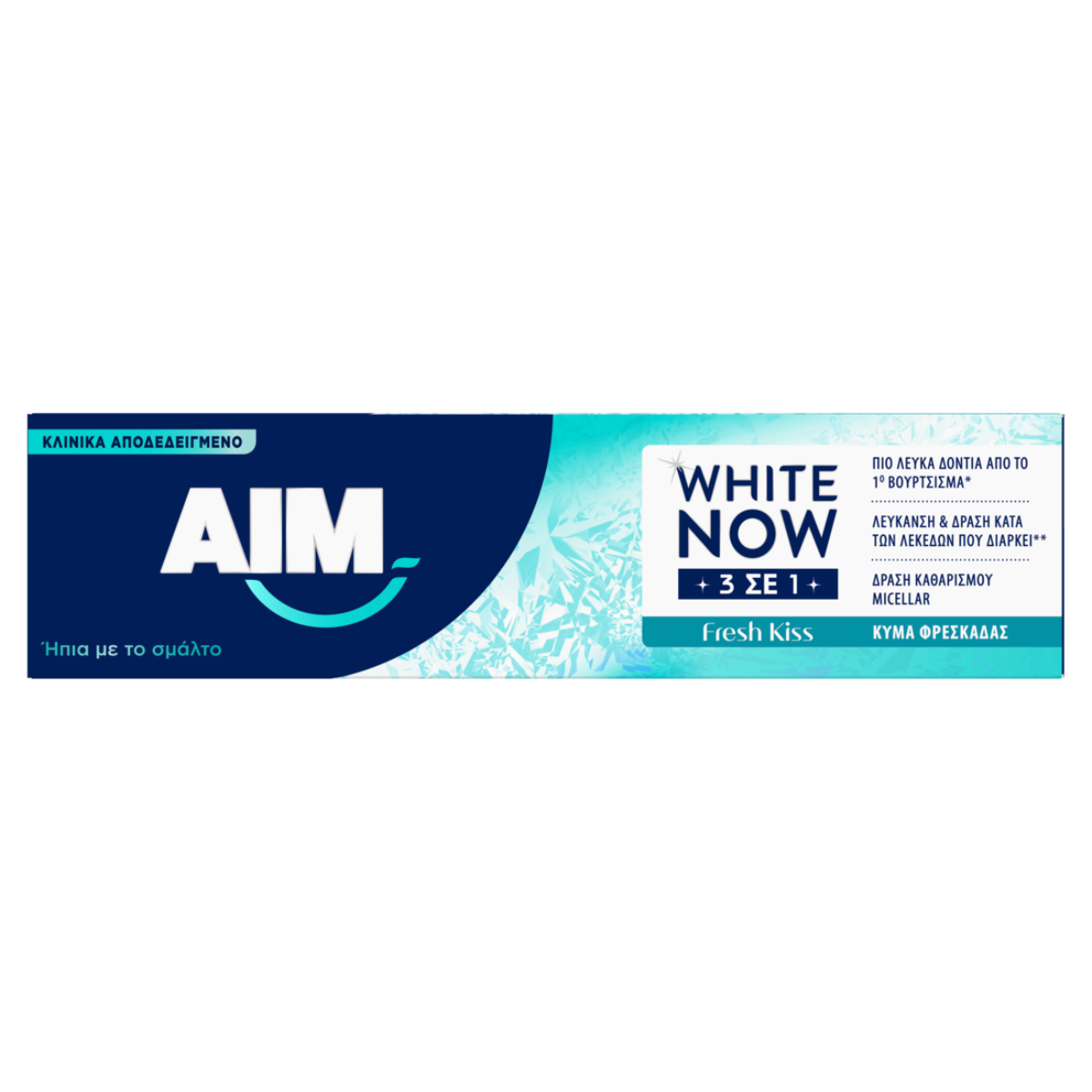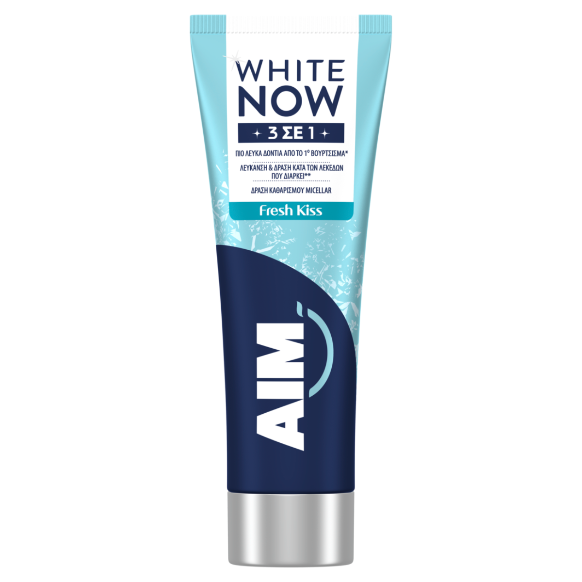 Η WHITE NOW 3 ΣΕ 1 FRESH KISS διαθέτει την ΤΕΧΝΟΛΟΓΙΑ TRIPLE LIGHT™: 1. ΠΙΟ ΛΕΥΚΑ ΔΟΝΤΙΑ ΑΠΟ ΤΟ 1ο ΒΟΥΡΤΣΙΣΜΑ*Τεχνολογία Blue-Saphire Optic με μπλε παράγοντες, οι οποίοι διορθώνουν άμεσα τον τόνο των δοντιών. 2. ΛΕΥΚΑΝΣΗ & ΔΡΑΣΗ ΚΑΤΑ ΤΩΝ ΛΕΚΕΔΩΝ ΠΟΥ ΔΙΑΡΚΕΙ**Αφαιρεί τους λεκέδες σε μόλις 3 ημέρες και δημιουργεί μία ασπίδα κατά των λεκέδων που διαρκεί.3. ΔΡΑΣΗ ΚΑΘΑΡΙΣΜΟΥ MICELLARΟ πλούσιος αφρός της αφαιρεί απαλά τα υπολείμματα, ενώ είναι ήπιος με το σμάλτο. ΚΥΜΑ ΦΡΕΣΚΑΔΑΣ. Για αίσθηση έντονης φρεσκάδας που διαρκεί.*Το αποτέλεσμα άμεσης λεύκανσης είναι οπτικό και προσωρινό. Κλινικά αποδεδειγμένο σε 54 άτομα, σε σύγκριση με μία απλή φθοριούχο οδοντόκρεμα.**Κλινική μελέτη σε 59 άτομα με συχνή χρήση 2 φορές την ημέρα για 2 εβδομάδες.Για παιδιά έως 6 ετών: Χρησιμοποιείτε ποσότητα σε μεγέθους μπιζελιού επιβλέποντας το παιδί κατά το βούρτσισμα των δοντιών του, έτσι ώστε να ελαχιστοποιείται η πιθανότητα κατάποσης. Αν ληφθεί φθόριο από άλλες πηγές, συμβουλευτείτε οδοντίατρο ή γιατρό.