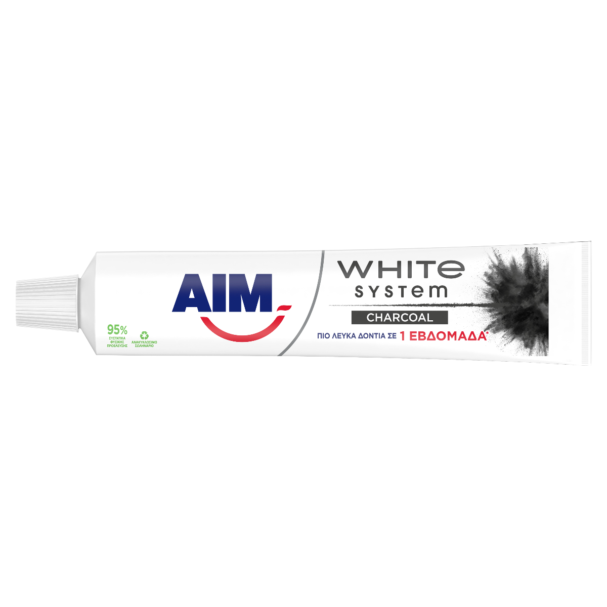 Aim White System Charcoal contains activated charcoal and helps in the natural whiteness of the teeth and the strengthening of the enamel. Its mild formula includes a naturally derived whitening ingredient that cleans enamel and is enriched with activated charcoal. It even contains fluoride for stronger teeth day after day. 95% natural origin ingredients WHITTER TEETH IN 1 WEEK* Recyclable Tube For a naturally white and bright smile in one week*. *Clinical study on the removal of stains in 55 people, with frequent use twice a day.