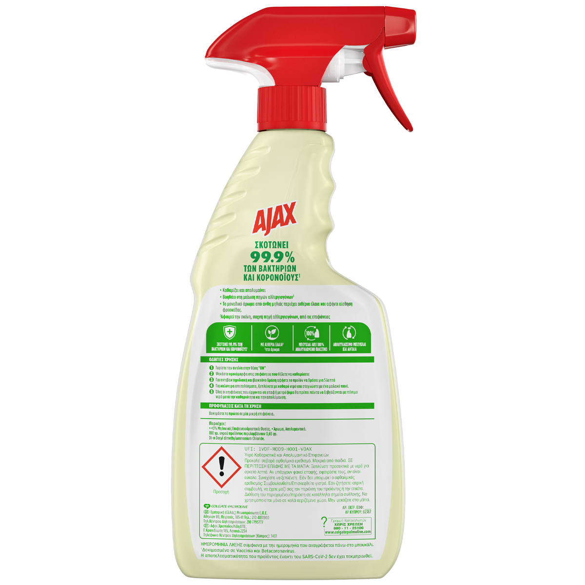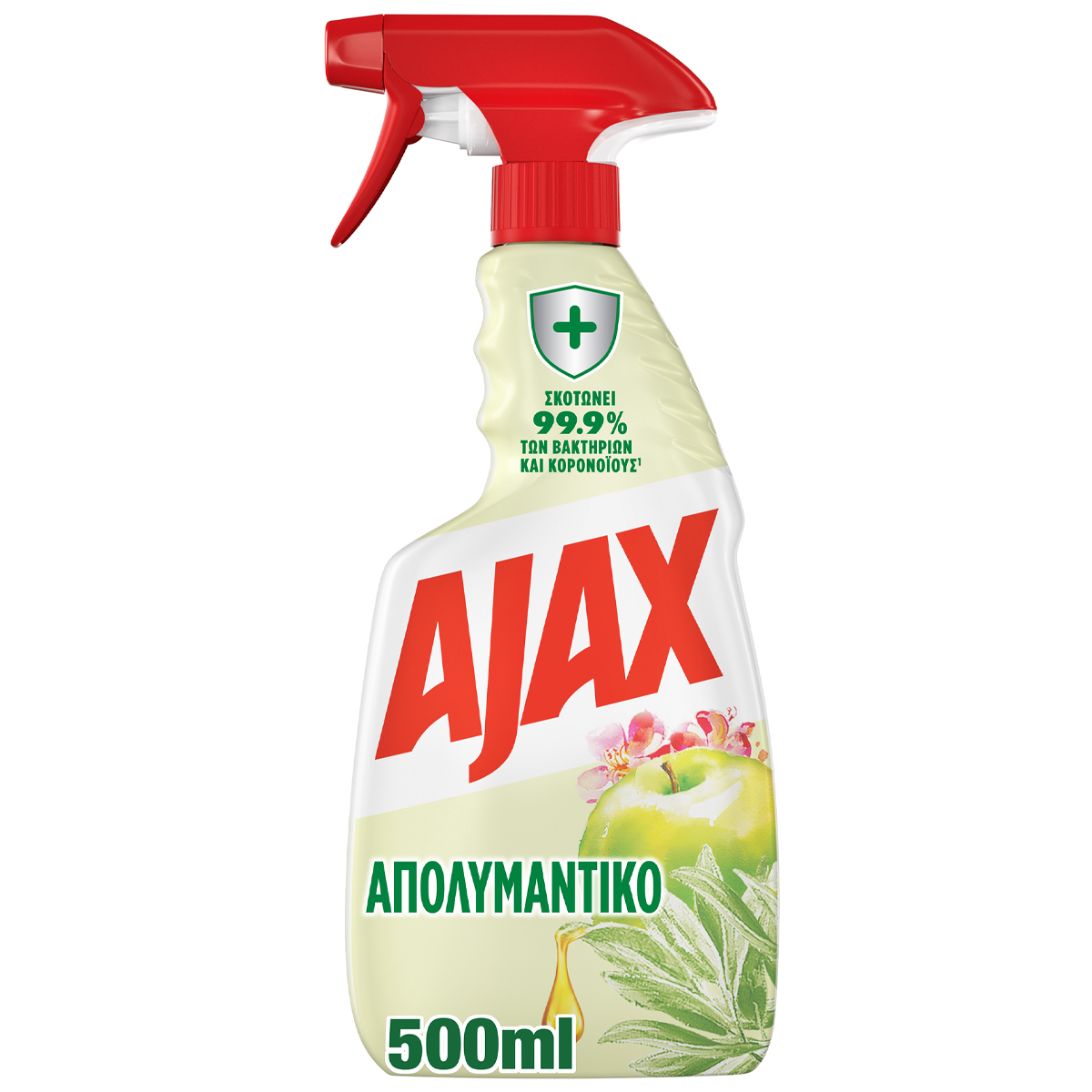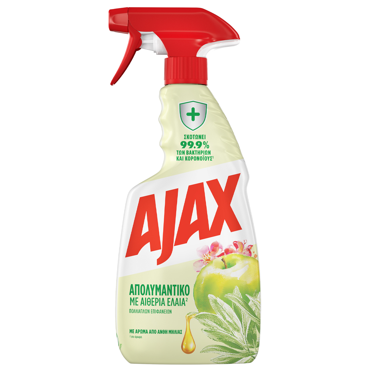 Ajax Disinfectant with Essential Oils: -Kill 99.9% of bacteria & coronaviruses; -Clean deeply; -Leave a fresh and lasting smell of apple blossoms; -Come in a recyclable bottle and pump/cap; -Bottle made of 100% recycled plastic.