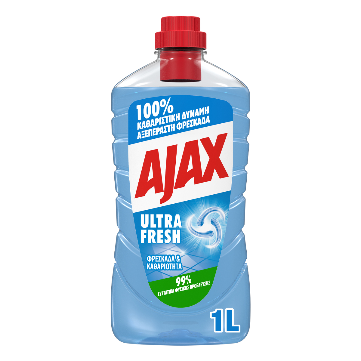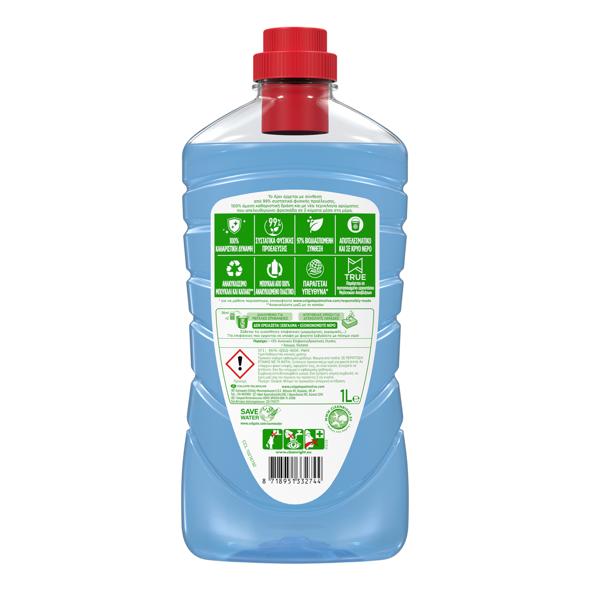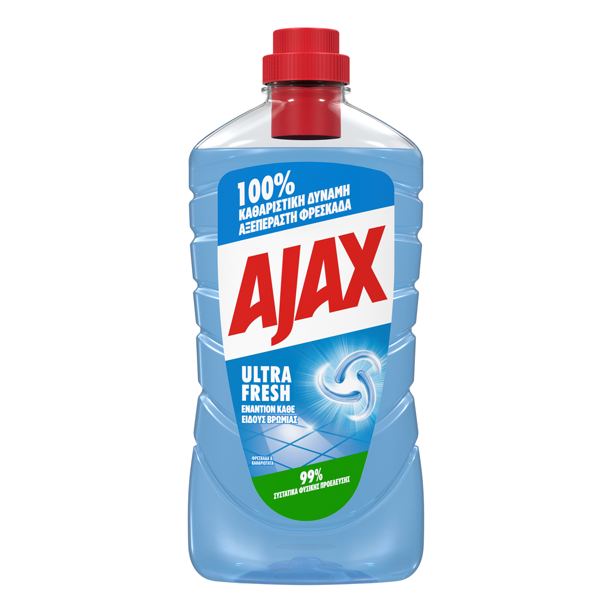 Biodegradable composition. Equal effectiveness. Ajax is renewed with 99% natural ingredients, 100% cleaning power, no microplastics. Recyclable bottle and cap. Bottle made of 100% recycled plastic. Manufactured in a certified zero waste factory.