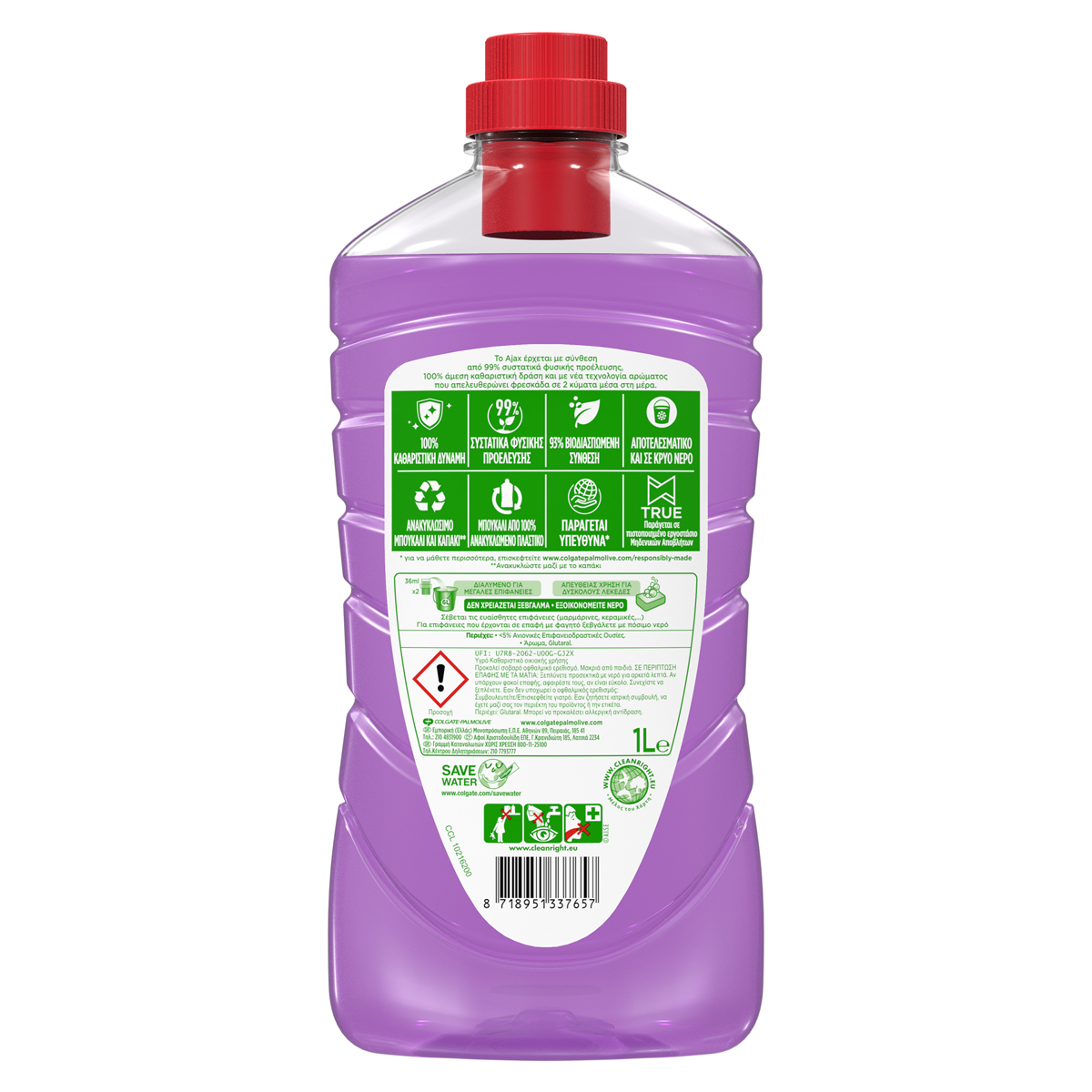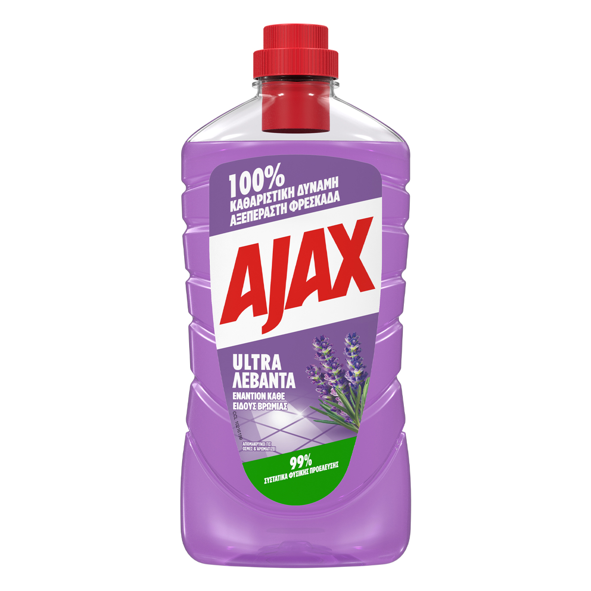 Biodegradable composition. Same effectiveness. Ajax is renewed with 99% natural origin ingredients, 100% cleaning power, no microplastics. Recyclable bottle and cap. Bottle made of 100% recycled plastic. Manufactured in a certified zero waste factory.
