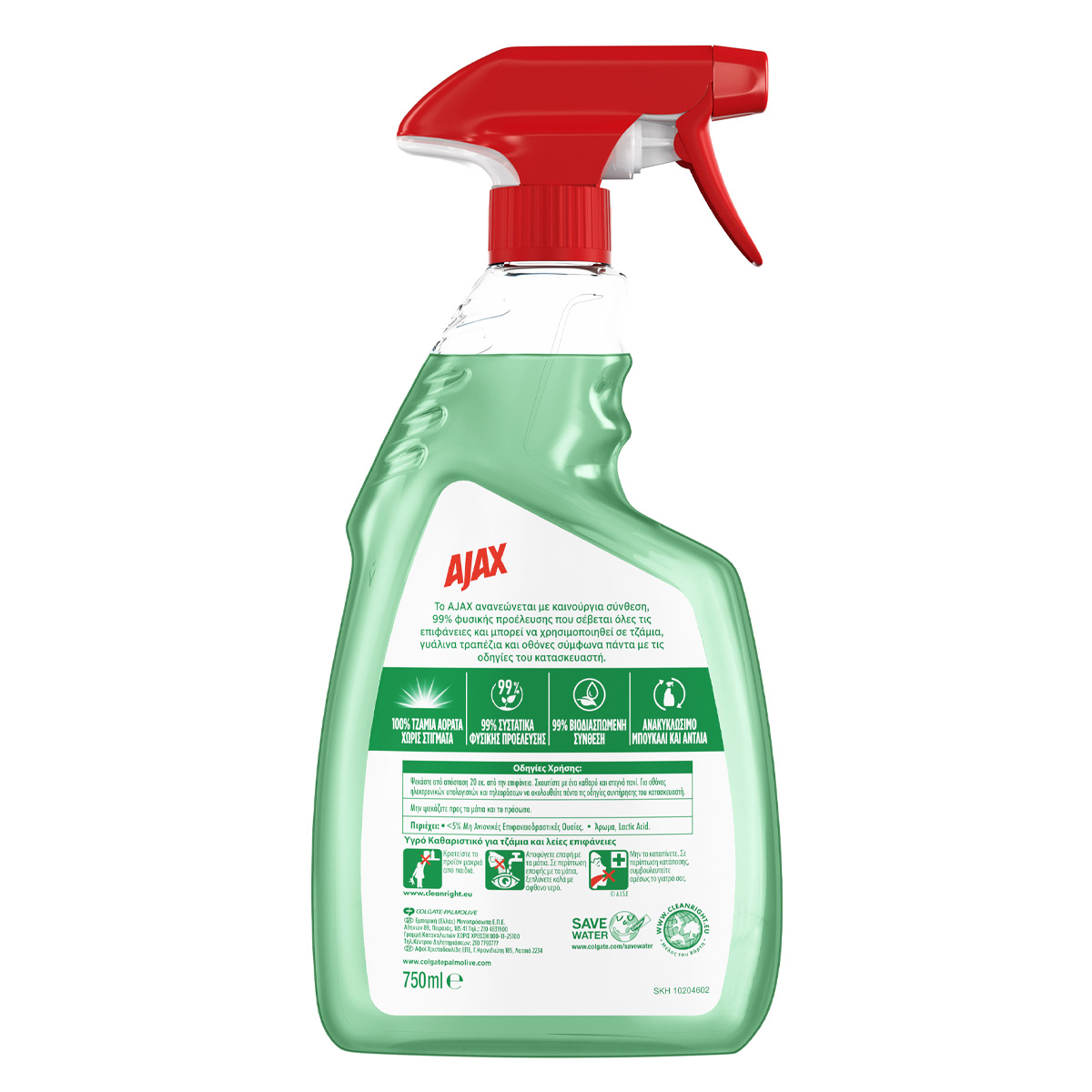 Ajax is renewed with a new 99% natural composition that respects all surfaces and can be used on glass, glass tables and screens according to the manufacturer's instructions. 100% invisible glazing without spots. 99% natural ingredients. 99% biodegradable composition. Recyclable bottle and pump. Produced responsibly.