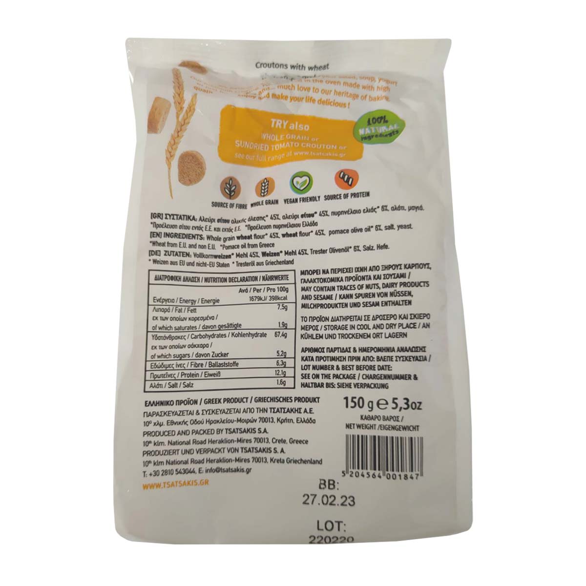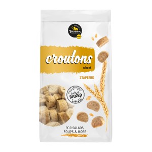 Double baked croutons with wheat. Baked in the oven with pure raw materials without preservatives and palm oil.