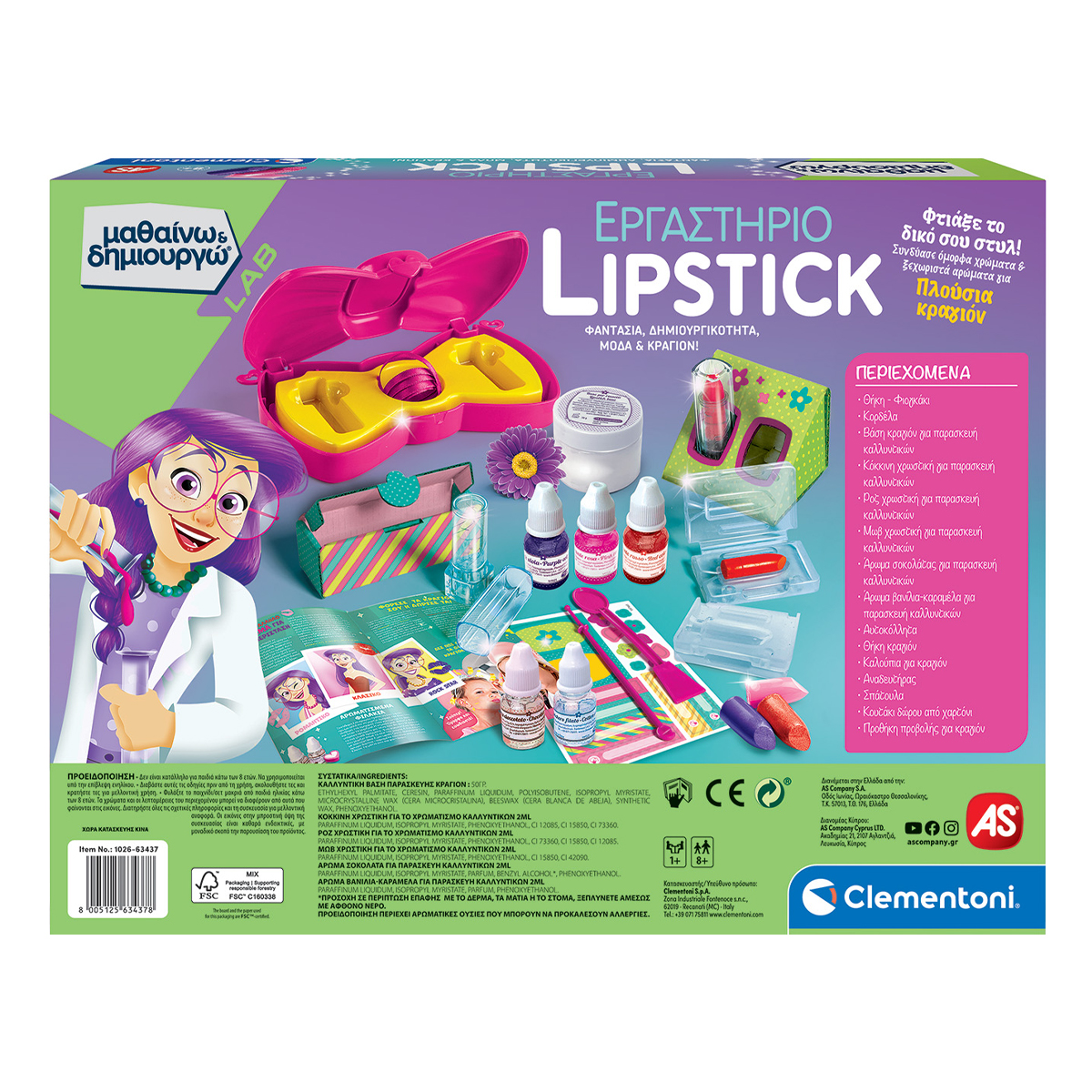 Ένα πλούσιο επιστημονικό σετ για να δημιουργήσεις απίστευτα κραγιόν και να ανακαλύψεις ότι η επιστήμη έχει χίλια χρώματα! Περιέχει όλα όσα χρειάζεσαι και επιστημονικό εξοπλισμό για να φτιάξεις κραγιόν με εύκολο και διασκεδαστικό τρόπο! Το πλούσιο εικονογραφημένο εγχειρίδιο θα καθοδηγήσει τα παιδιά σε όλα τα στάδια παραγωγής και θα τα οδηγήσει να ανακαλύψουν τα μυστικά των καλλυντικών.