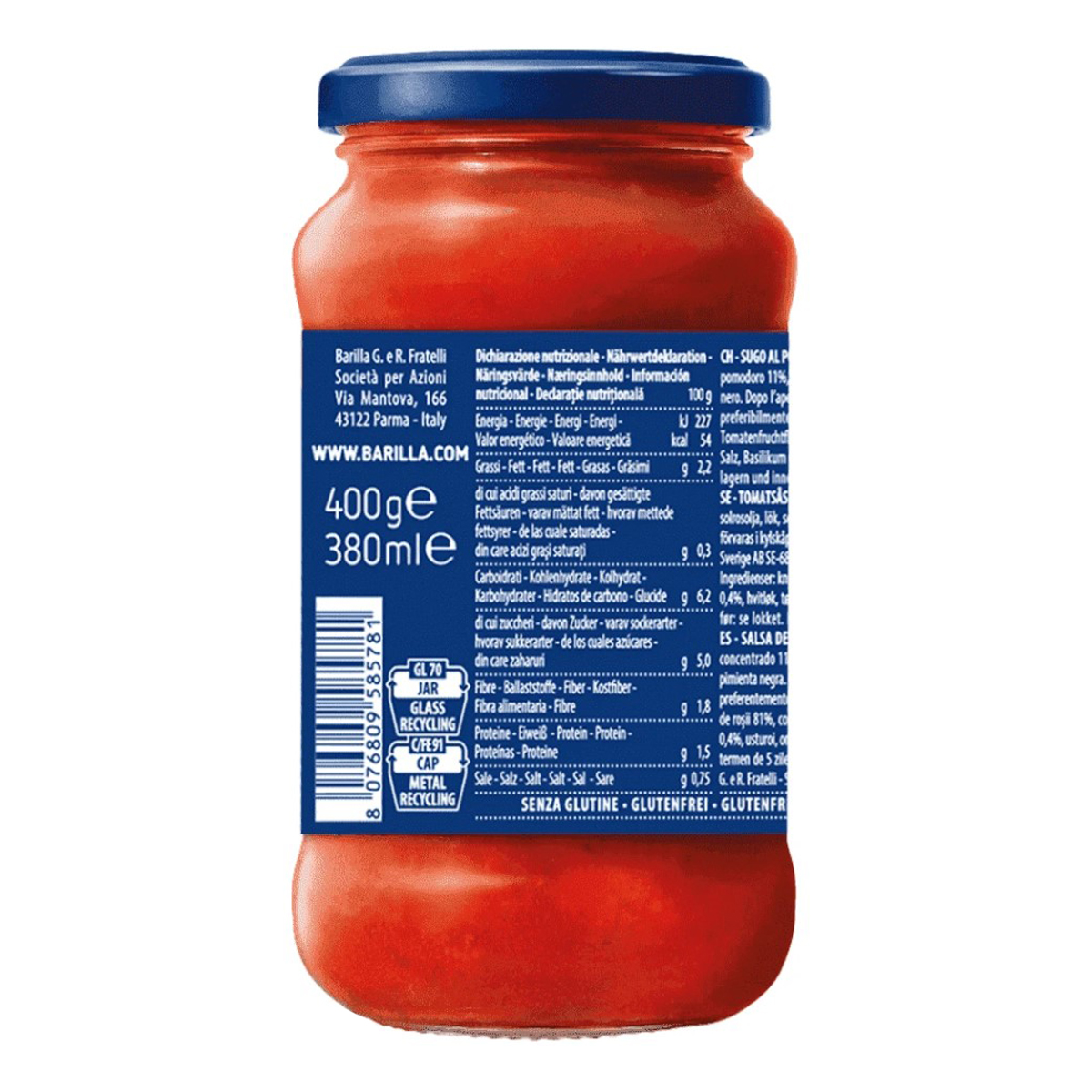 Tomato puree 81%, concentrated tomato juice 11%, sunflower oil, onion, sugar, salt, basil 0,4%, garlic, oregano, black pepper.