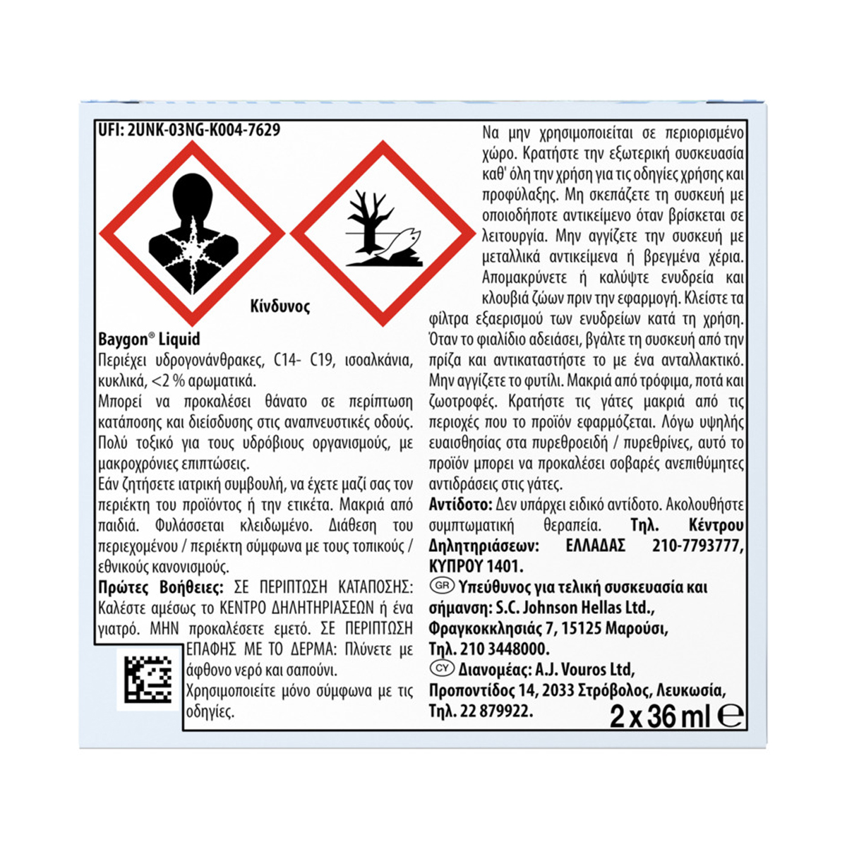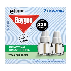 Baygon® Liquid offers protection against mosquitoes (and the "Asian Tiger Mosquito") indoors. Its formula is fragrance-free. One vial is enough for a 30sqm space and its action lasts for up to 60 nights when used 8 hours a night. It works with a slim device easy to use, with a bright operation indicator. The level of liquid in the vial can be easily observed: when the liquid runs out, simply replace the vial with a 36 ml replacement for another 60 nights of protection. Effective also against the tiger mosquito.
