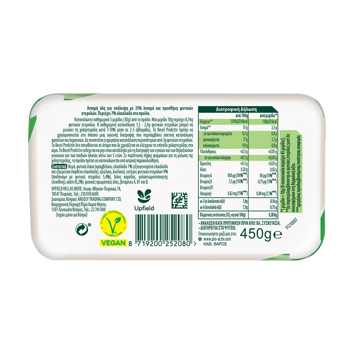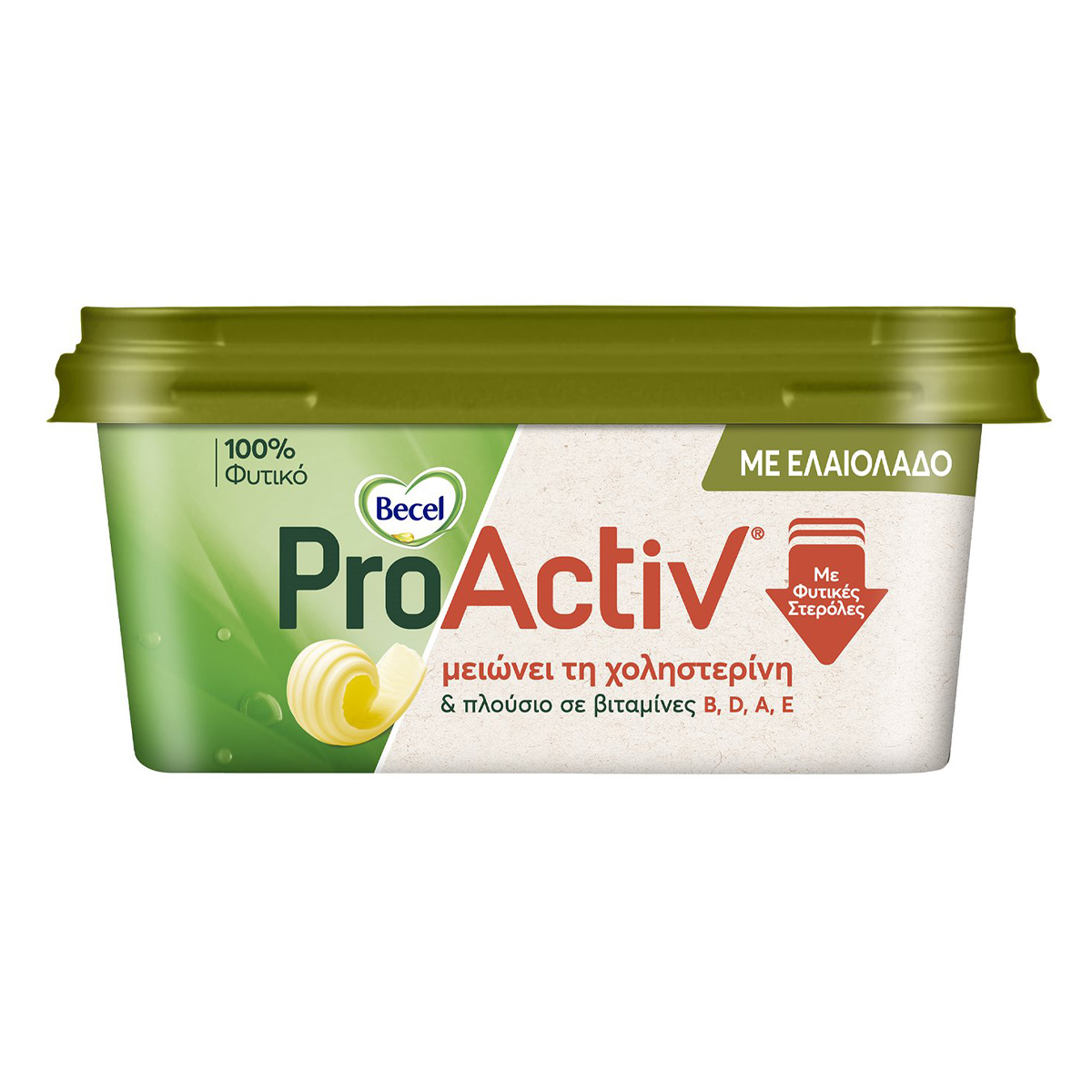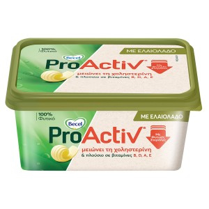 Becel ProActiv with Olive Oil 225g is a spreading product with added olive oil, which is clinically proven to effectively reduce cholesterol 7-10% in 2-3 weeks in the context of a balanced diet and a healthy lifestyle.It is rich in vitamins A, B1, B2, B2, B6, B12, D, E, and is a source of folic acid.