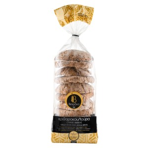 Kneaded in the most traditional way and baked in a wood-fired oven. Made from whole wheat and barley without any additional processing and with pure virgin olive oil. A product of high nutritional value, rich in fibre that ensures proper intestinal function.
