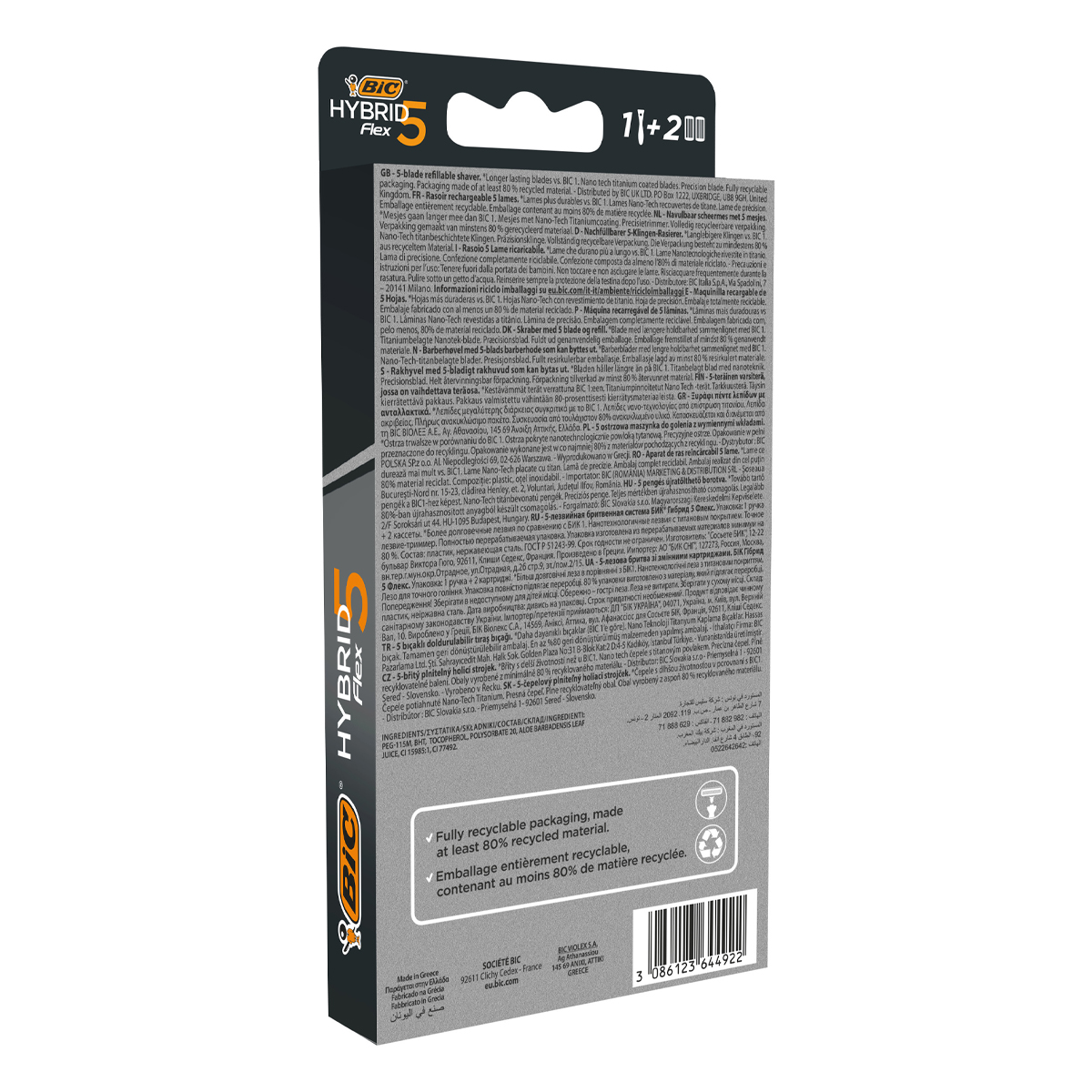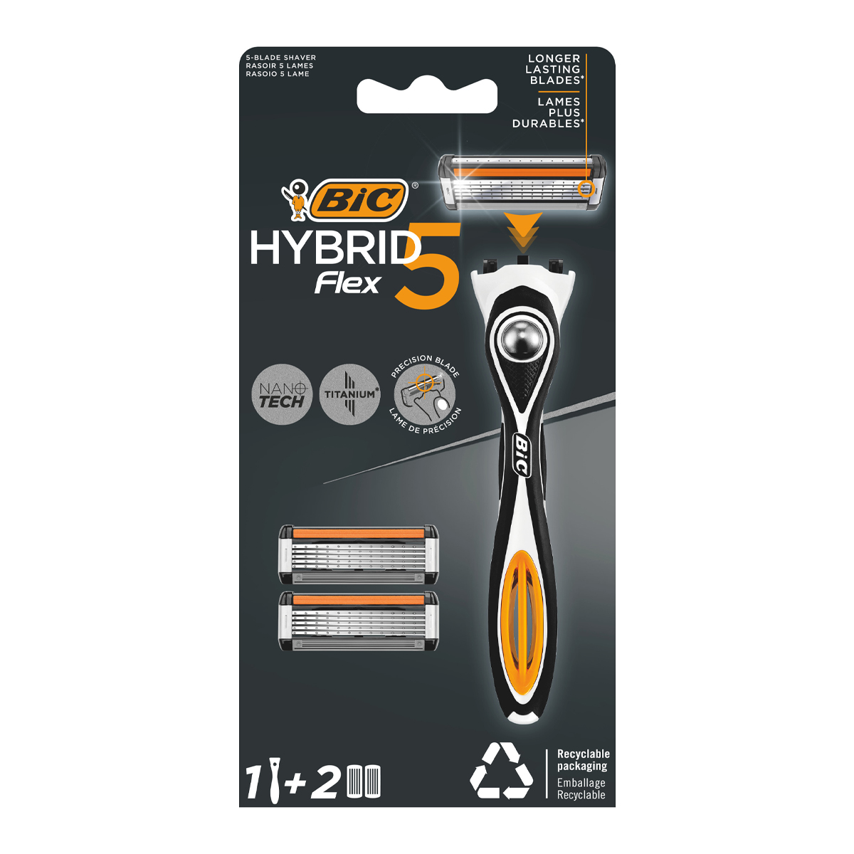 BIC's best shaving performance with the BIC Hybrid 5 Flex shaving set for men. Featuring 1 ergonomically designed handle and 2 spares, each with 5 movable blades that independently adjust to the curves of your face for an even deeper shave. In addition to the nanotechnology blades, use the precision blade for the toughest parts of the face. Greater control during shaving thanks to the movable head with up to 40° tilt and metal balance ball. Perfect glide on the skin thanks to the lubricating strip. Enjoy a perfect shave with BIC's quality and performance guarantee, now in recyclable packaging.