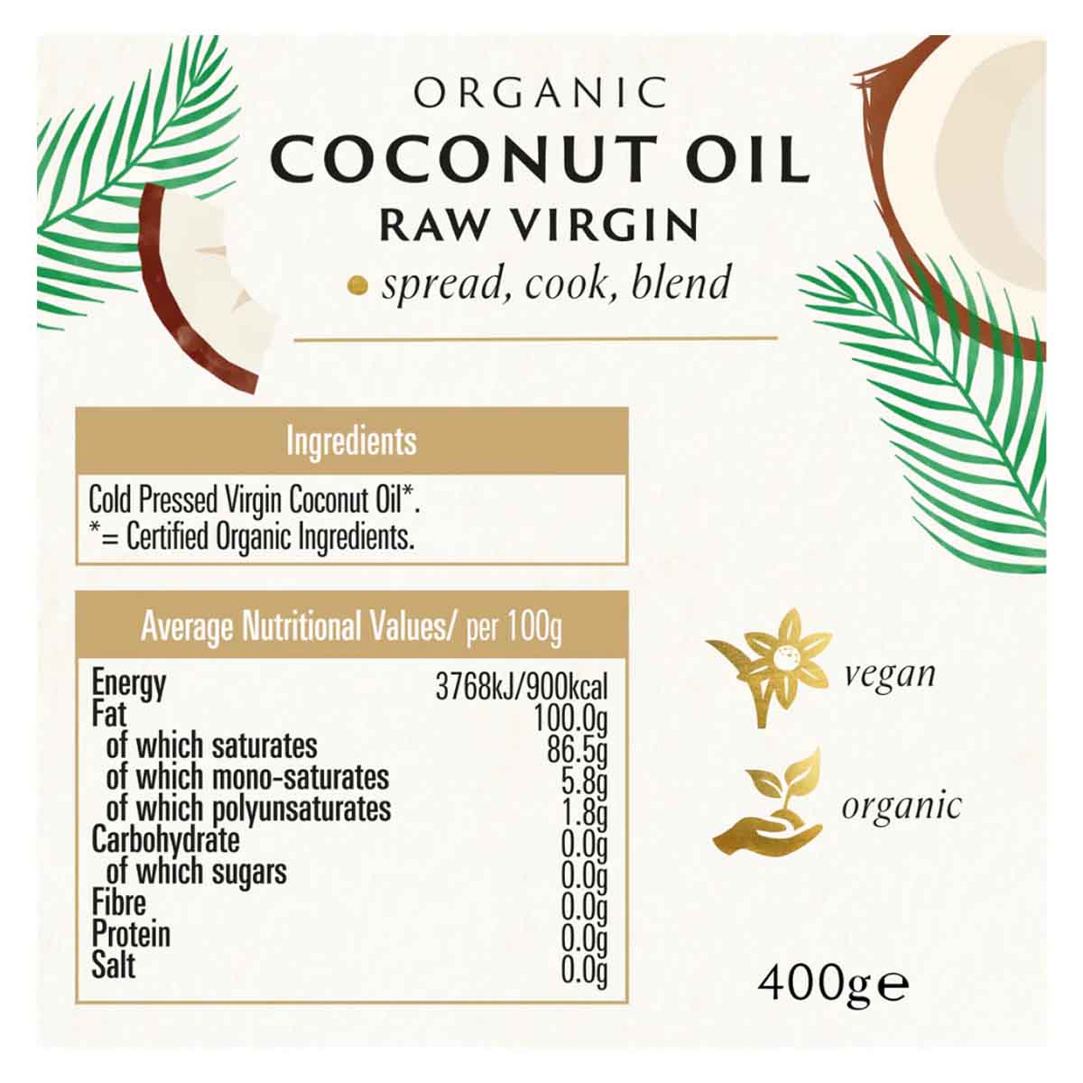 Organic virgin coconut oil, cold-pressed from the flesh of organic walnuts, unbleached, without additives, non-hydrogenated. Coconut oil is considered one of the most functional fats with many beneficial properties. Not only does it not increase the levels of 'bad' cholesterol in the blood (LDL) but on the contrary, it increases good cholesterol (HDL) and has slightly lower calories than other vegetable fats. Research has shown that it supports the immune system and reduces the likelihood of cardiovascular disease. It is excellent for weight loss because it is not metabolized as fat by the body but is instead forwarded to the liver, where it is used directly for energy (energy fat). In addition, it promotes the fat burning process (thermogenesis). It is rich in lauric acid, with strong antibiotic, antibacterial and antifungal properties. It is ideal for spreading and very useful as a cooking ingredient because it does not burn or oxidize at high temperatures. It can also be used for cosmetic use on the skin and hair. It contains no cholesterol, trans-fats and genetically modified ingredients.