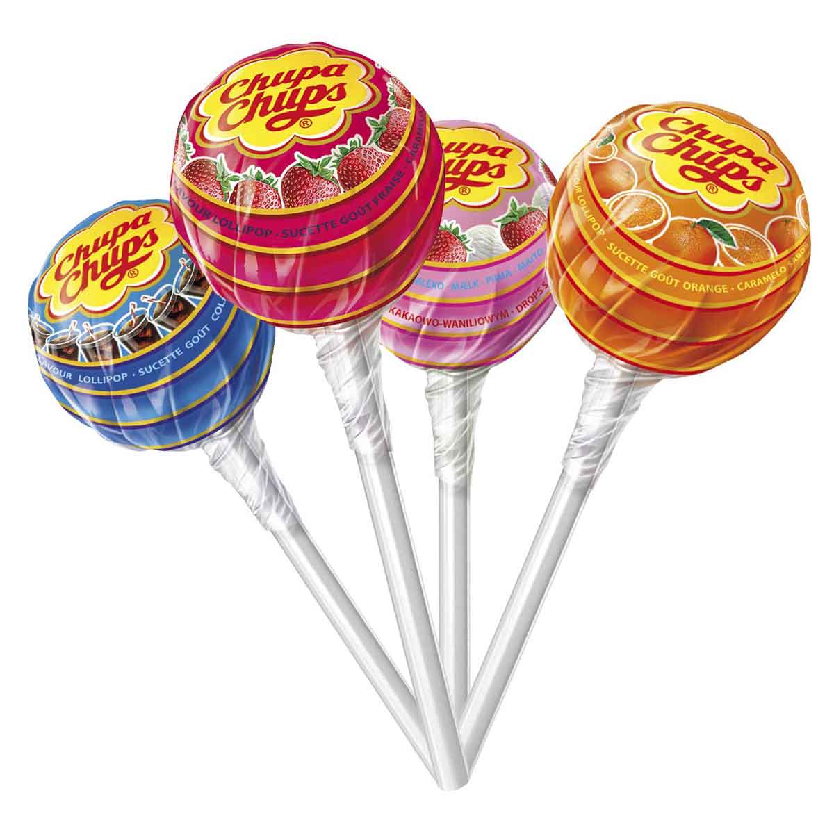 Lollipops in 4 different flavours: strawberry, cola, strawberry-cream and cocoa-vanilla. With natural colourings.