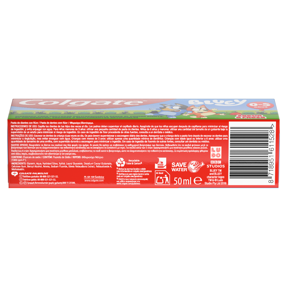 Φροντίστε τα δόντια των παιδιών σας με την παιδική οδοντόκρεμα Colgate Bluey 0-5 ετών. Απολαύστε με τον Bluey και τον Bingo «την πραγματική εμπειρία», που προσφέρει αυτή η παιδική οδοντόκρεμα με γεύση φράουλα, που θα φροντίσει απαλά τα πρώτα δόντια του παιδιού σας.