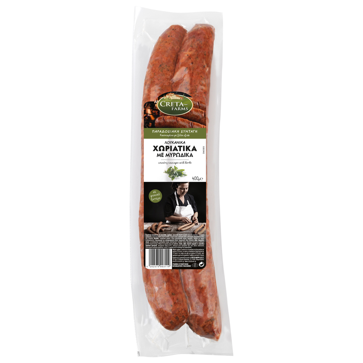 Traditional, authentic recipe, inspired by Crete. Fine pork meat is mixed with a variety of Cretan herbs, wrapped in natural intestine and smoked in beech wood, offering a rich taste and unique aroma. Made from superior quality ingredients, with modern production processes.