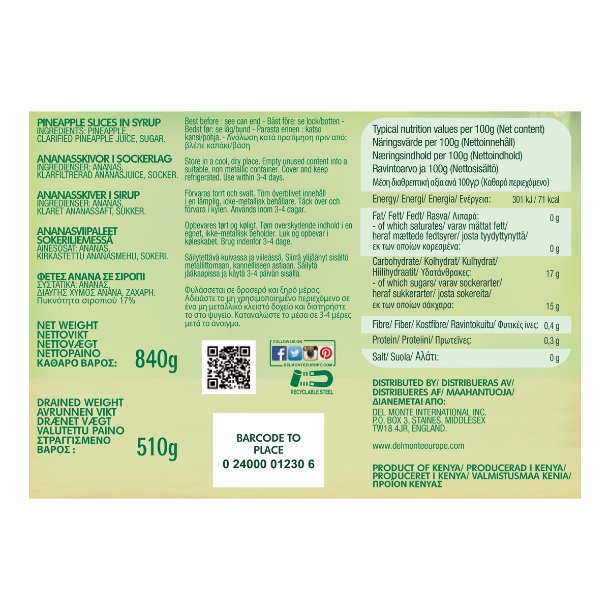 Slices of juicy pineapple, selected at maturity, packed fresh in syrup.