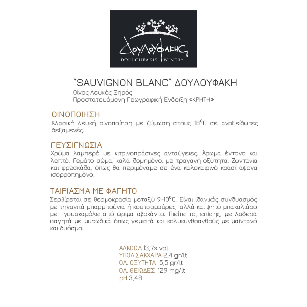 Sauvignon Blanc 100%, with a touch of Crete! The warm climate enriches the aroma and gives the wine body and soul, without taking away its freshness and vitality. This variety, compared to other international varieties, fully exploits the island's unique terroir, revealing its unique character.