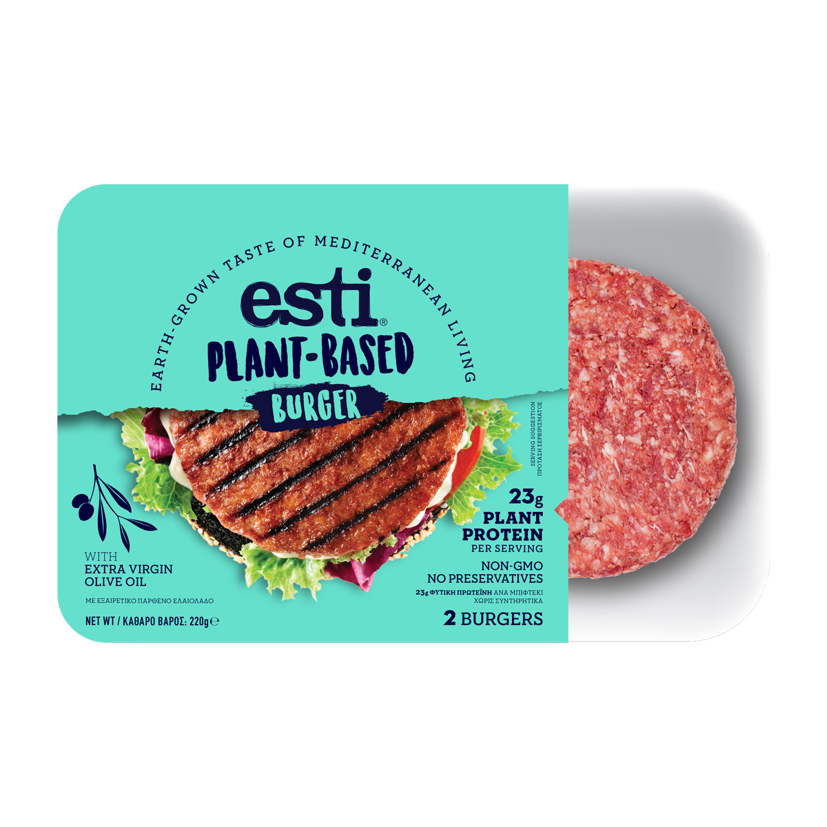 2 delicious esti® Plant-based Burger burgers ready to grill. With extra virgin olive oil. No preservatives. 23 grams of plant-based protein per burger. The ultimate vegetarian and delicious choice.