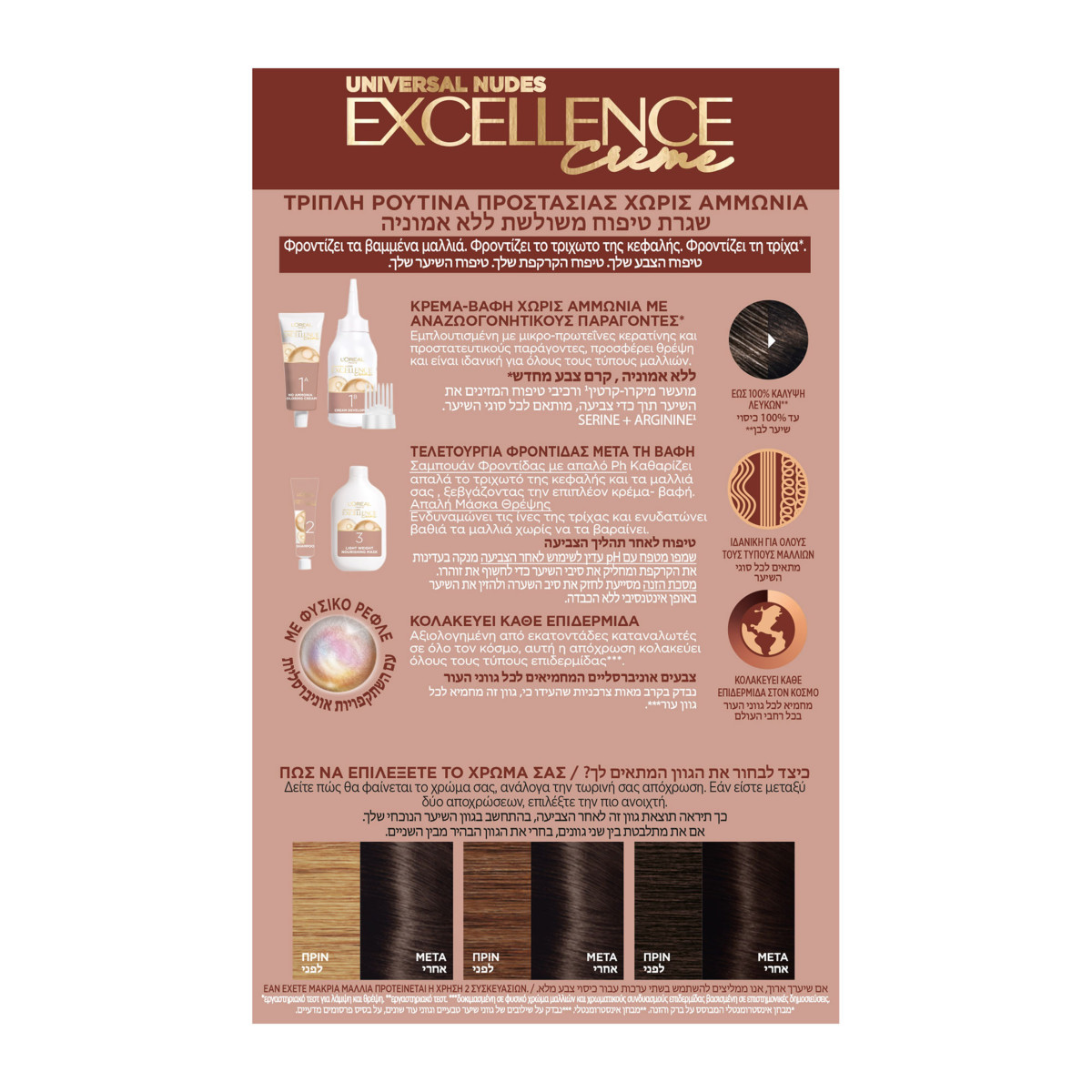 Excellence Universal Nudes hair dye by L'Oreal Paris offers the rich intensity and vibrancy of permanent hair color, without ammonia. It includes Pro-Keratin complex and conditioning agents to protect hair as it is coloured. This colour: - Offers 100% coverage of white hair, without ammonia; - Is enriched with Pro-Keratin Complex; - Provides rich, shiny and natural colour; - Gives a feeling of softness to the hair and scalp; - Contains no parabens, phthalates or mineral oils; - Is ideal for all hair types and textures